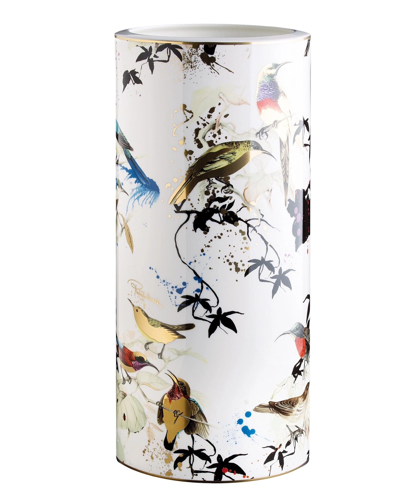 - Duży wazon na kwiaty Garden's Birds marki Roberto Cavalli. Motyw ptaków zaczerpnięty z kolekcji modowej projektanta 2016 roku. Wykonany z porcelany kostnej, ręcznie ozdabiany złotymi elementami.