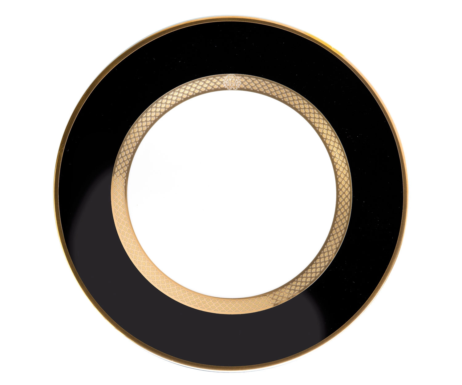 Wyjątkowo eleganckie talerze obiadowe Python Black od marki Roberto Cavalli. Zestaw 6 sztuk. Czarno-złote z subtelnym zdobieniem. Wykonane z najwyższej jakości porcelany kostnej z ręcznie malowanym brzegiem.