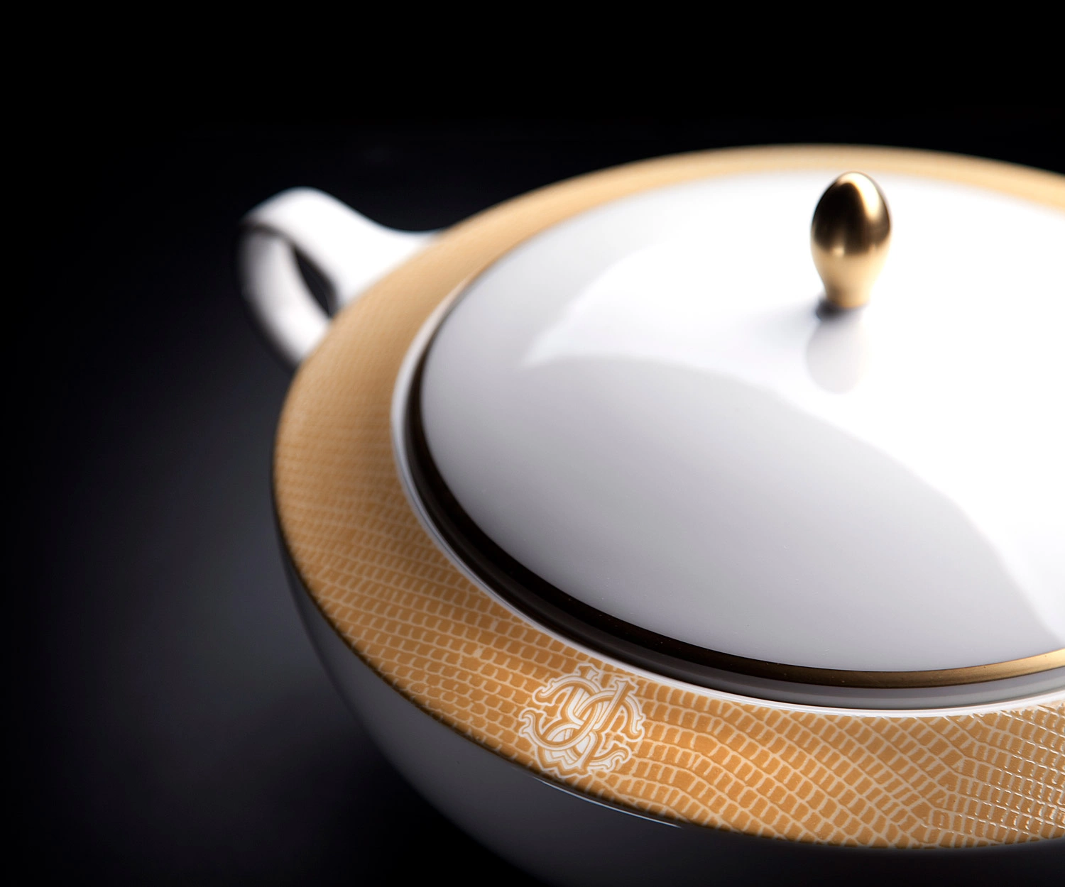 - Miseczka na owoce z kolekcji Lizzard Gold od marki Roberto Cavalli. Subtelnie wytłoczony wzór skóry jaszczurki na porcelanie, centralnie monogram marki. Wykonana z porcelany kostnej ze złotymi, ręcznie malowanymi zdobieniami.