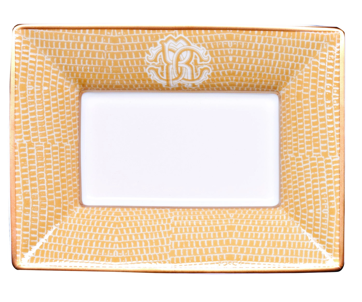 - Półmisek prostokątny z kolekcji Lizzard Gold od marki Roberto Cavalli. Subtelnie wytłoczony wzór skóry jaszczurki na porcelanie, centralnie monogram marki. Wykonany z porcelany kostnej ze złotymi, ręcznie malowanymi zdobieniami.