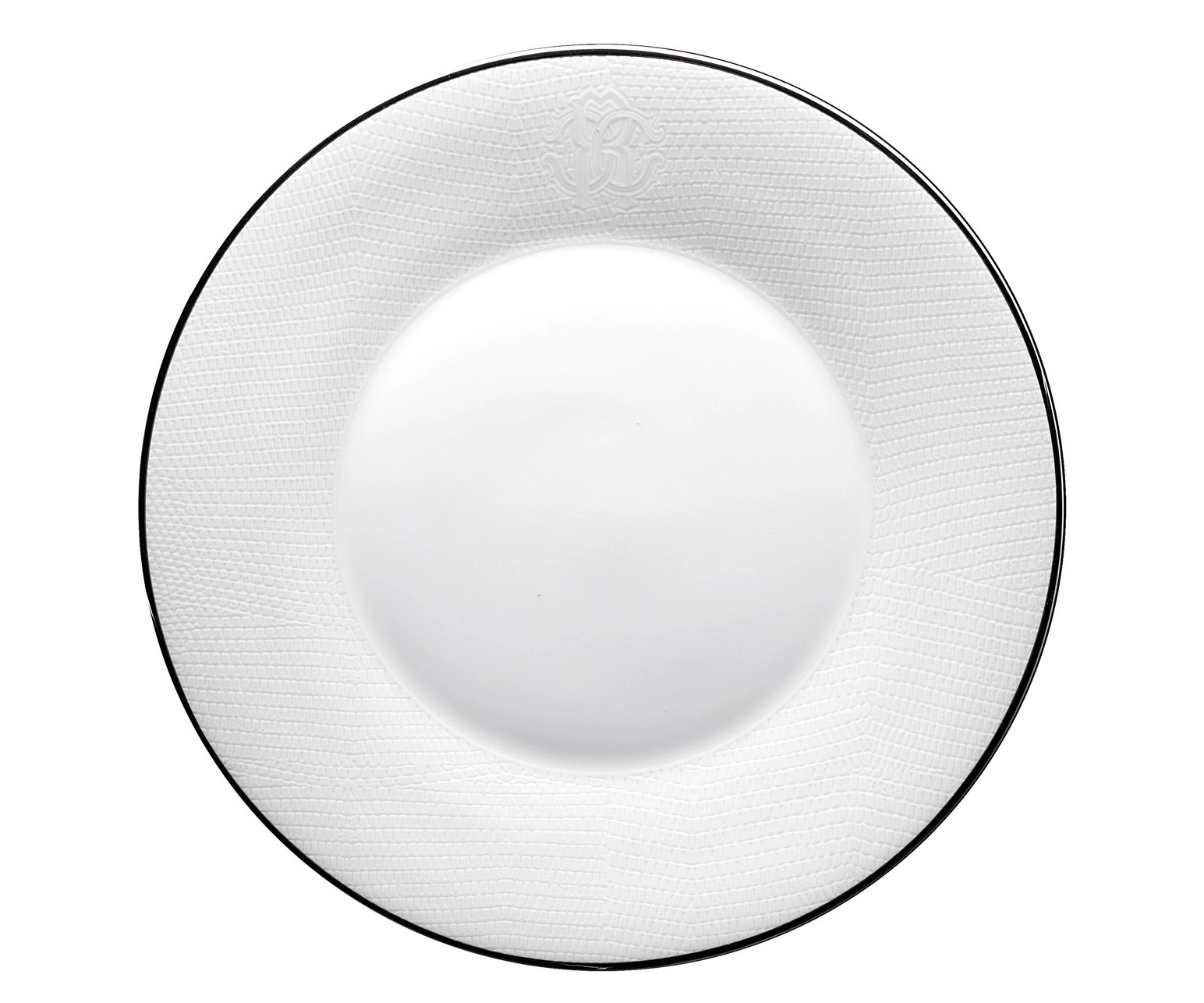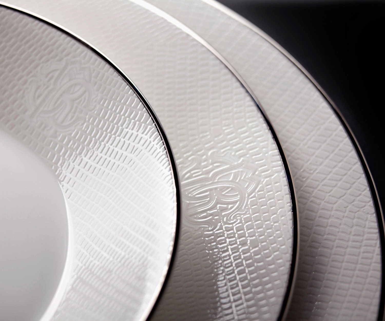 Talerz głęboki do zupy z kolekcji Lizzard Platin od marki Roberto Cavalli. Subtelnie wytłoczony wzór skóry jaszczurki na białej porcelanie, centralnie monogram marki. Wykonana z porcelany kostnej z platynowymi, ręcznie malowanymi zdobieniami.