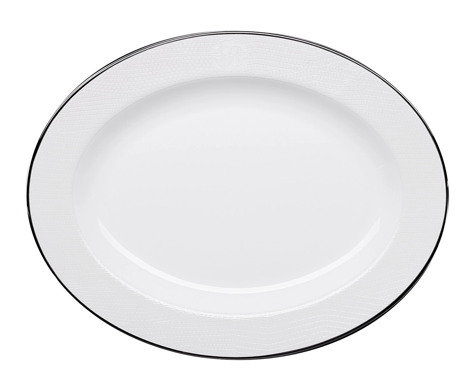 - Półmisek 36 cm z kolekcji Lizzard Platin od marki Roberto Cavalli. Subtelnie wytłoczony wzór skóry jaszczurki na białej porcelanie, centralnie monogram marki. Wykonany z porcelany kostnej z platynowymi, ręcznie malowanymi zdobieniami.