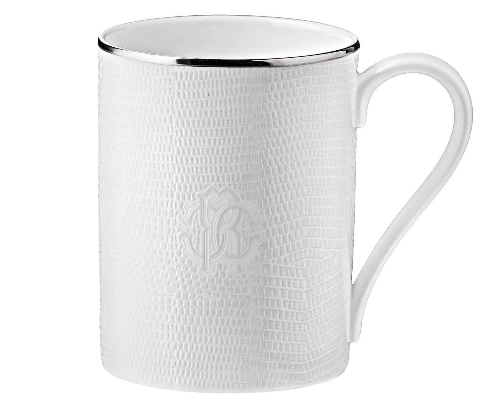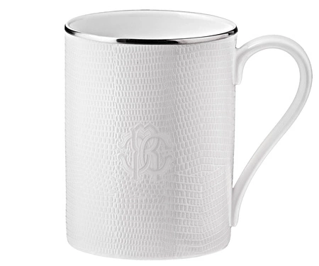 Kubek z kolekcji Lizzard Platin od marki Roberto Cavalli. Subtelnie wytłoczony wzór skóry jaszczurki na białej porcelanie, centralnie monogram marki. Zapakowany w eleganckie pudełko. Wykonany z porcelany kostnej z platynowymi, ręcznie malowanymi zdobieniami.