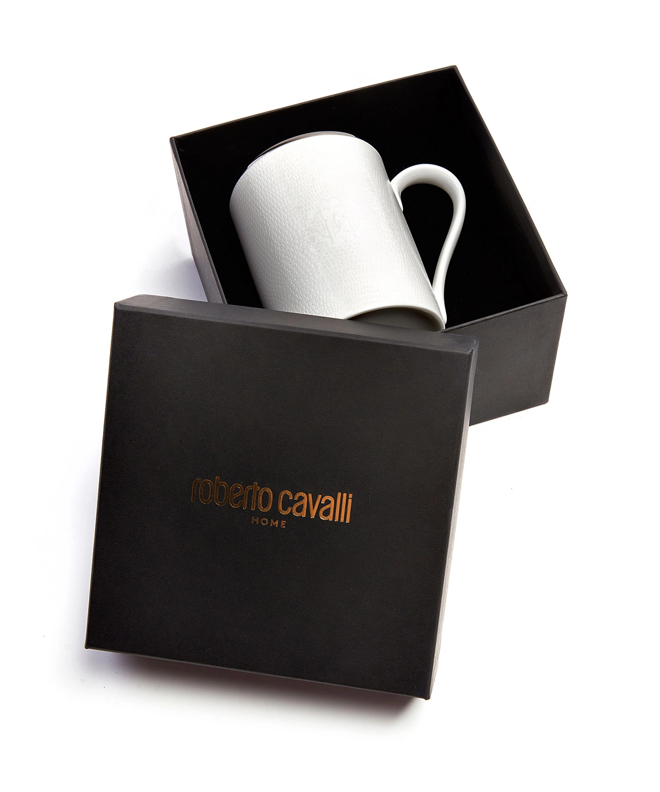 • Kubek z kolekcji Lizzard Platin od marki Roberto Cavalli. Subtelnie wytłoczony wzór skóry jaszczurki na białej porcelanie, centralnie monogram marki. Zapakowany w eleganckie pudełko. Wykonany z porcelany kostnej z platynowymi, malowanymi zdobieniami.
