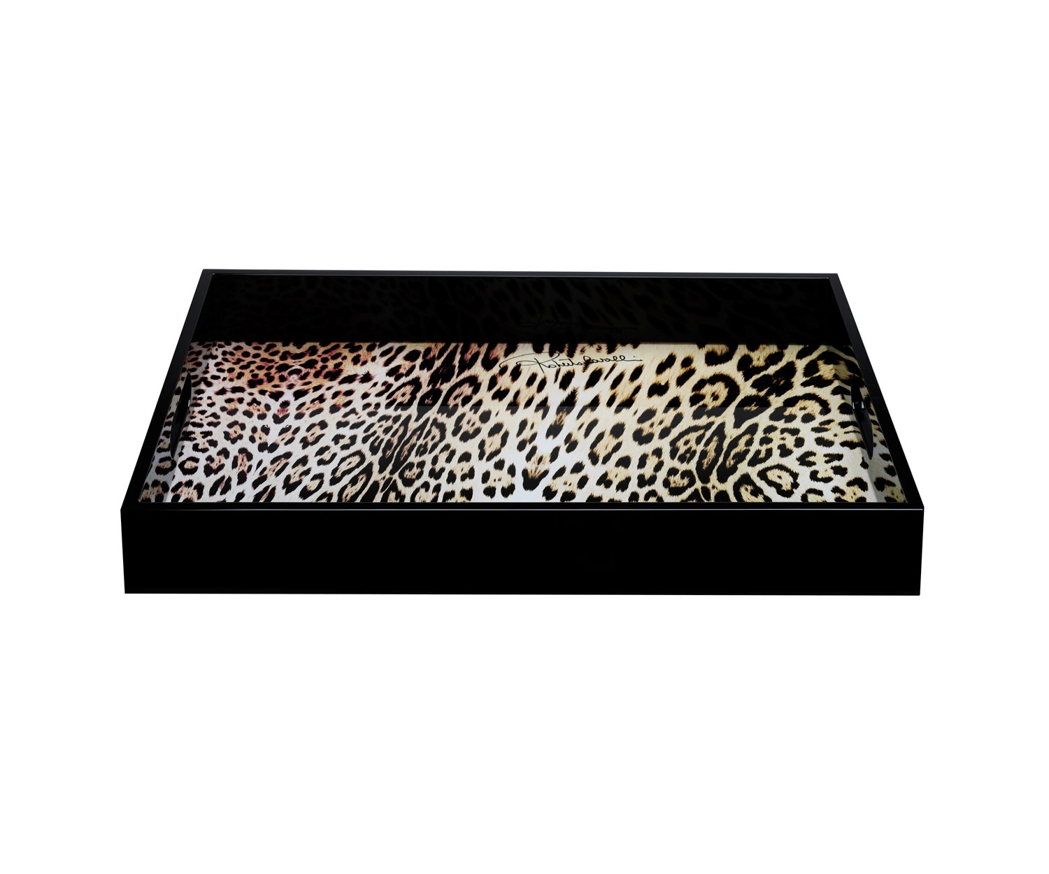 - Mała drewniana taca Jaguar od marki Roberto Cavalli. Wykonana z lakierowanego drewna. Dno z pięknym ozdobnym, zwierzęcym printem, boki czarne.