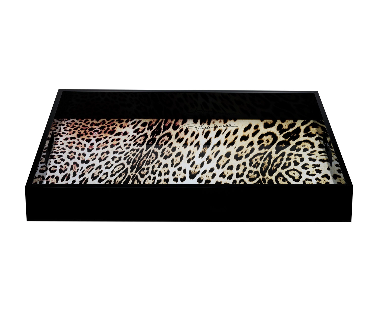 - Średnia drewniana taca Jaguar od marki Roberto Cavalli. Wykonana z lakierowanego drewna. Dno z pięknym ozdobnym, zwierzęcym printem, boki czarne.