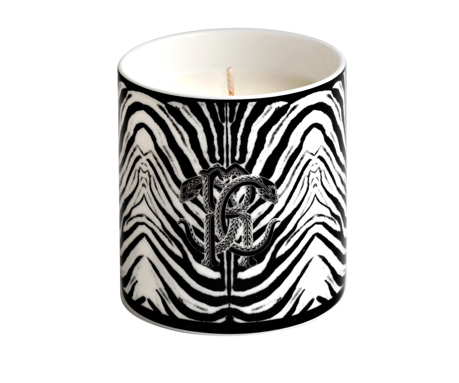 Zapachowa świeca Black Zebra marki Roberto Cavalli. Wosk umieszczony w luksusowym pojemniku z porcelany kostnej z monogramem i ręcznie malowanymi złoceniami. Zapach drzewno-orientalny.