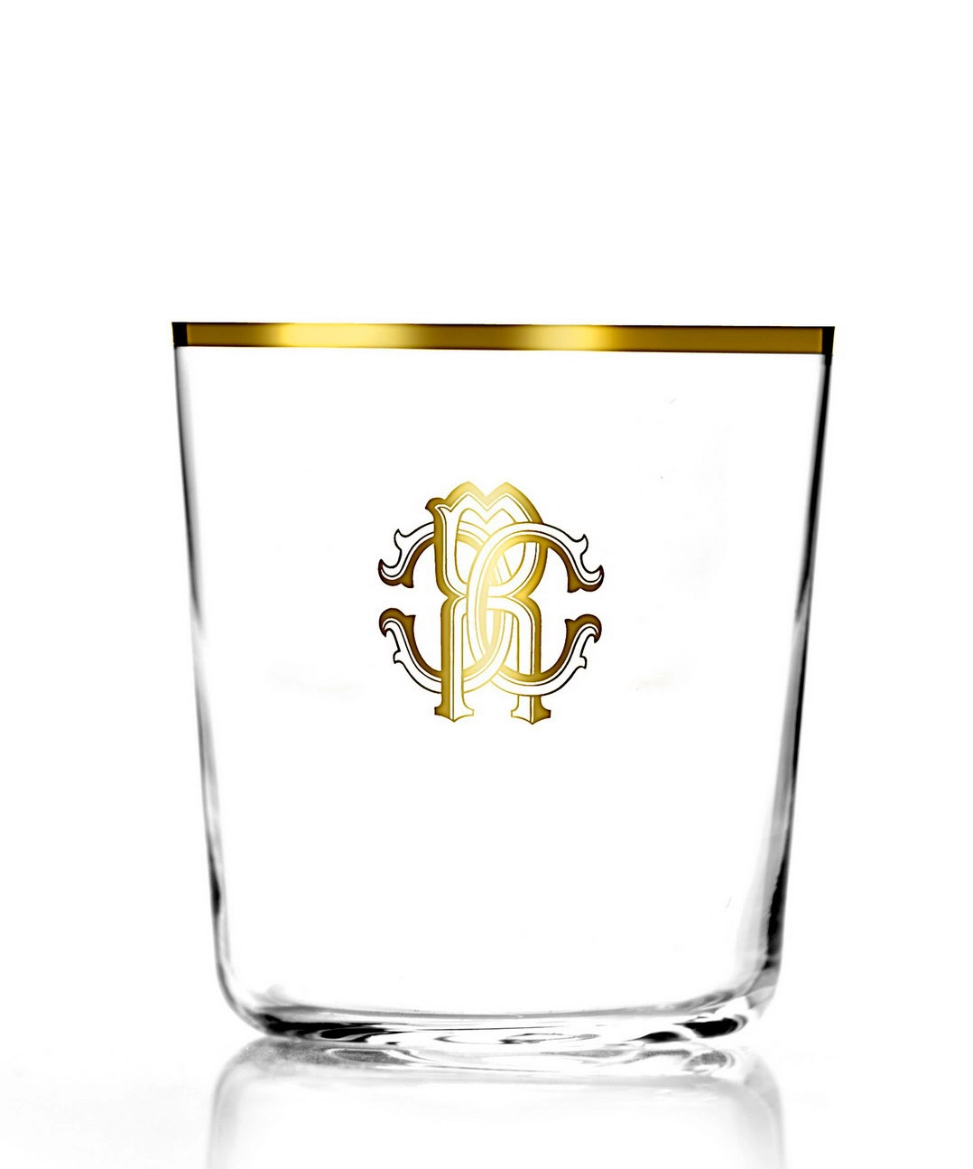 Szklanka do whisky typu Old Fashion od marki Roberto Cavalli. Kolekcja Monogramma Gold. Ozdobiona niewielkim monogramem oraz ręcznie malowanym, złotym zdobieniem. Zestaw 6 sztuk.