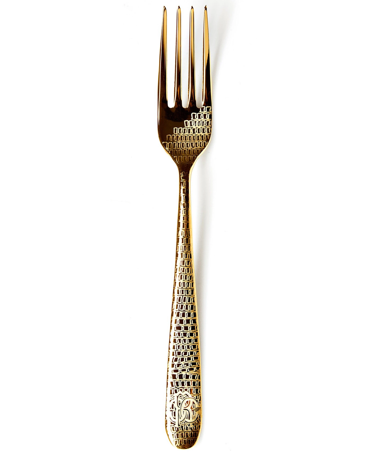 - Zestaw 6 widelców deserowych z kolekcji Lizzard Gold od marki Roberto Cavalli. Rękojeść ozdobiona motywem przypominającym skórę jaszczurki. Wykonane ze stali nierdzewnej pokrytej warstwą 24-karatowego złota o grubości 0,5 μm.