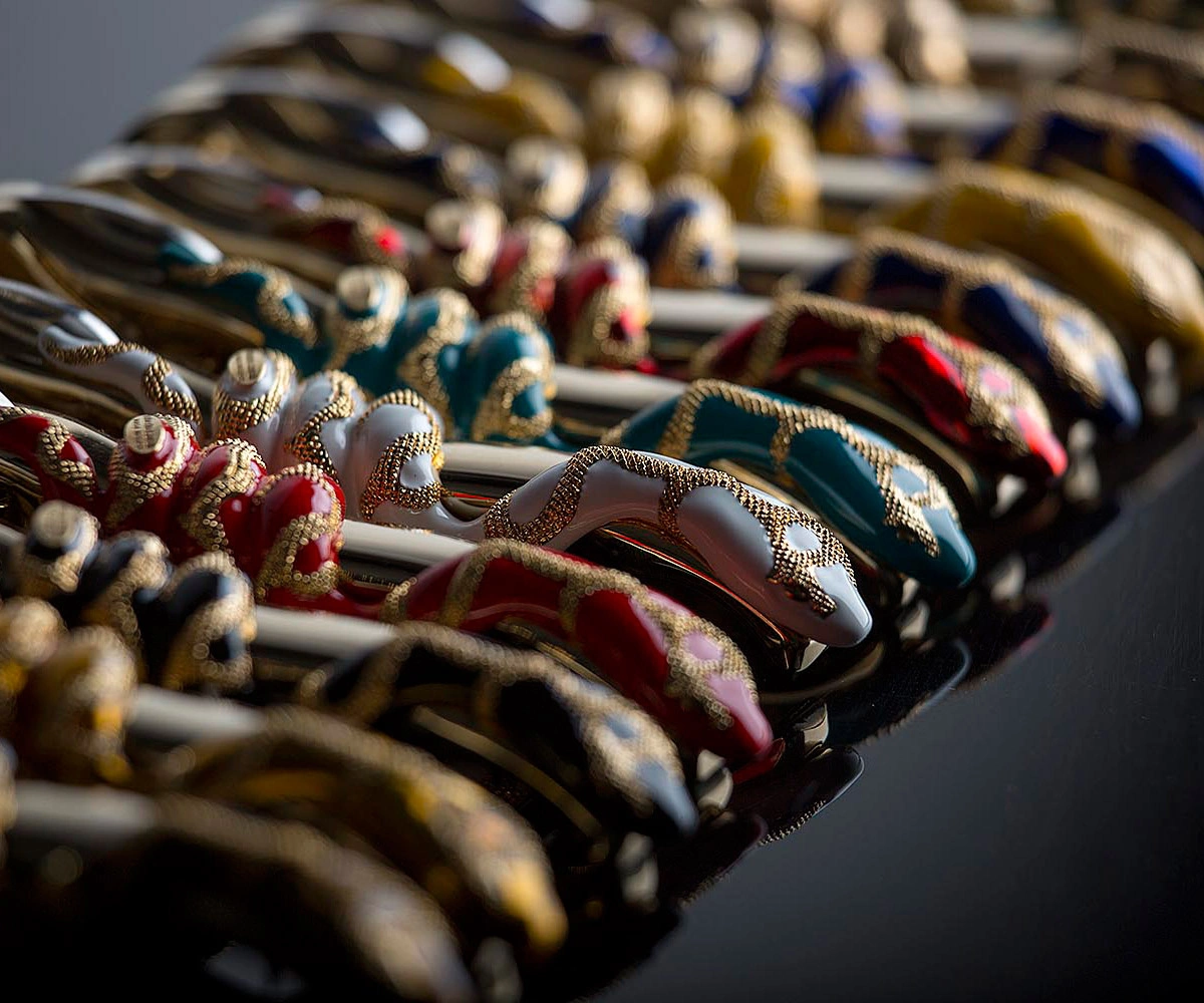 - Luksusowy otwieracz do wina Snake od marki Roberto Cavalli. Wykonany z mosiądzu, kolor głęboki granat. Rękojeść ozdobiona motywem węża, bogata w detale. Idealny na prezent dla miłośnika wina, zapakowany w eleganckie pudełko.