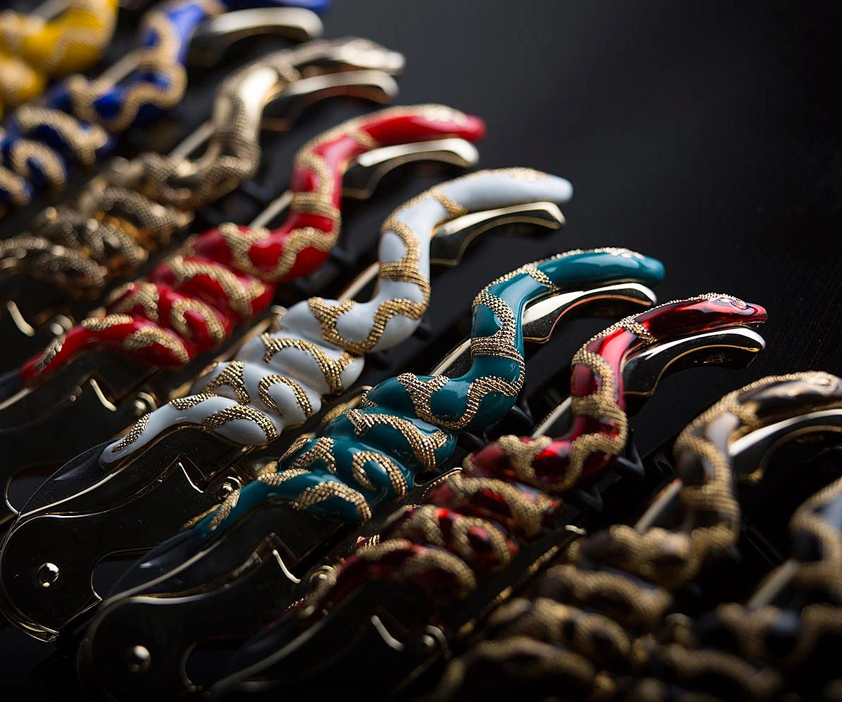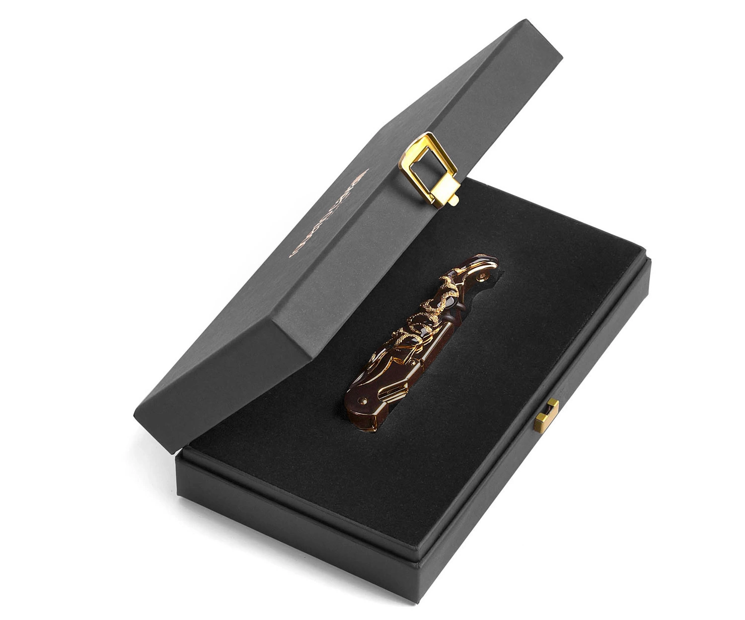 - Luksusowy otwieracz do wina Snake od marki Roberto Cavalli. Wykonany z mosiądzu, kolor morski. Rękojeść ozdobiona motywem węża, bogata w detale. Idealny na prezent dla miłośnika wina, zapakowany w eleganckie pudełko.