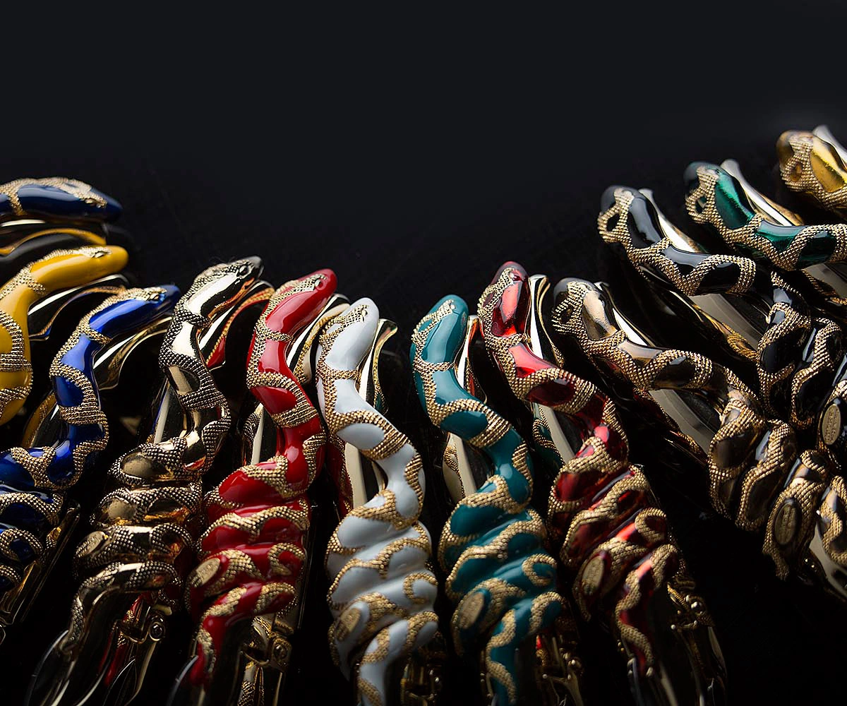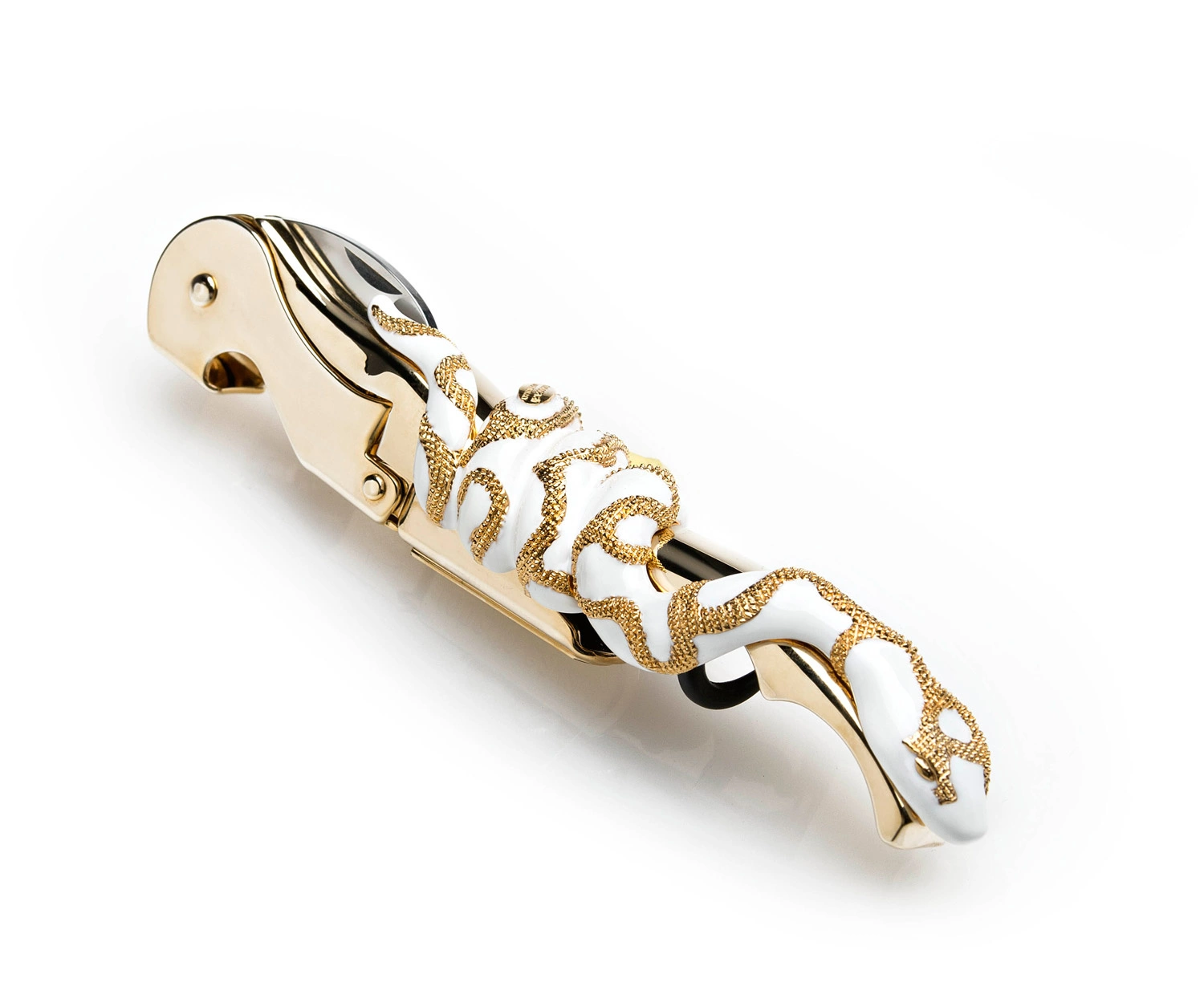 - Luksusowy otwieracz do wina Snake od marki Roberto Cavalli. Wykonany z mosiądzu, kolor biały. Rękojeść ozdobiona motywem węża, bogata w detale. Idealny na prezent dla miłośnika wina, zapakowany w eleganckie pudełko.
