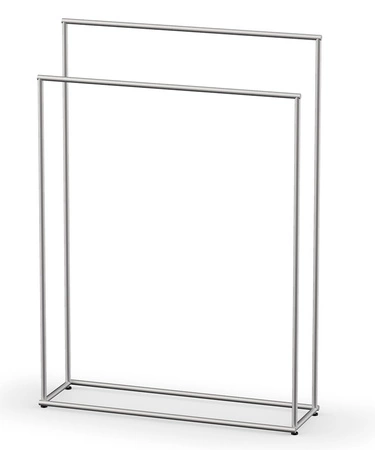 - Stojak na ręczniki MK HT marki Decor Walther. Dwie poprzeczki umieszczone na różnych wysokościach, przymocowane do prostokątnej podstawy, wykonany ze sali nierdzewnej w matowym wykończeniu.