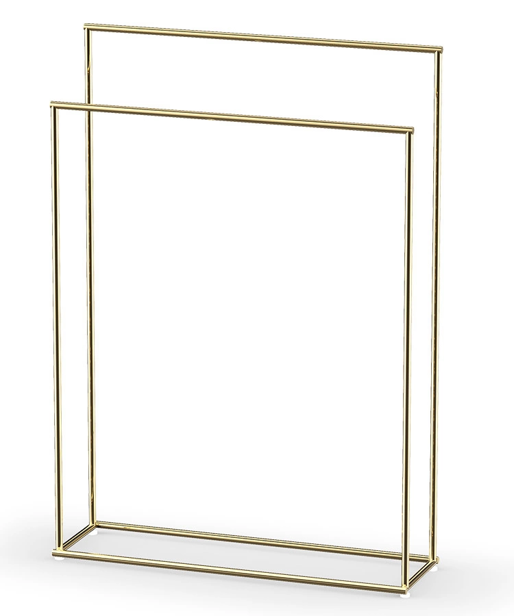 • Stojak na ręczniki MK HT marki Decor Walther. Dwie poprzeczki umieszczone na różnych wysokościach, przymocowane do prostokątnej podstawy, wykonany z mosiądzu pokrytego 24 karatowym złotem.