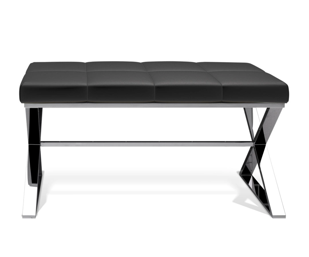 - Ławka Bench marki Decor Walther. Siedzisko wykonane z czarnej, trwałej eko-skóry, delikatnie pikowane. Stelaż wykonany ze stali nierdzewnej polerowanej. Piękny design, idealny mebel na chwilę odpoczynku w łazience, sypialni lub przedpokoju.