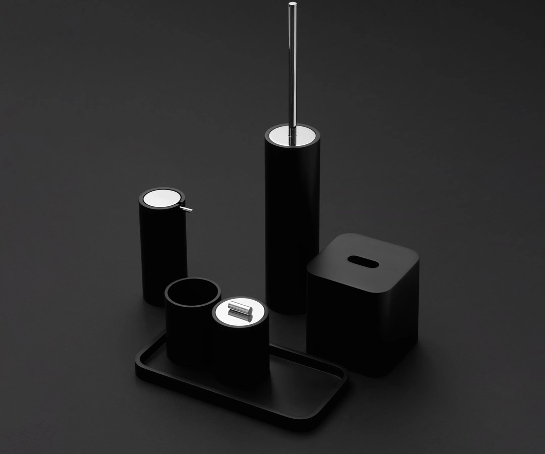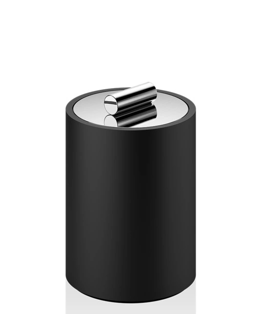 Pojemnik z przykrywką STONE DMD S marki Decor Walter. Wykonany z czarnego kompozytu, o okrągłym przekroju. Przykrywka z uchwytem pokrytym chromem. Idealny na drobne akcesoria łazienkowe.
