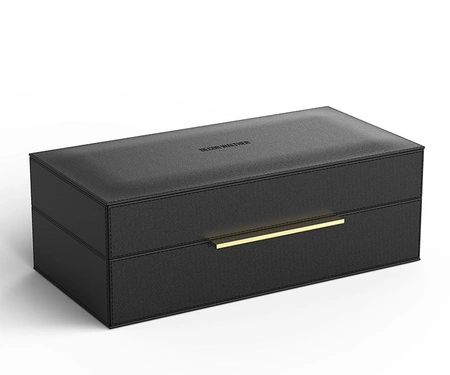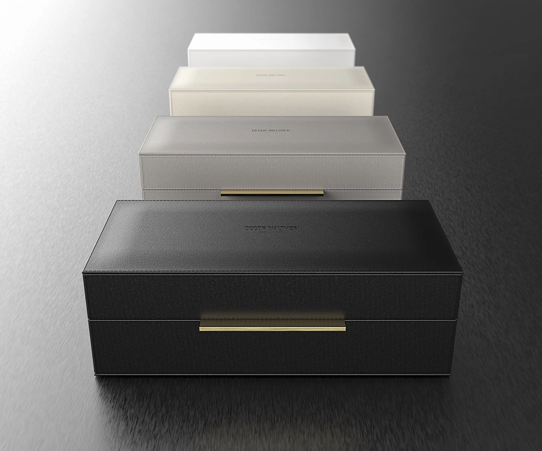 - Eleganckie pudełko z przykrywką BROWNIE BOX S marki Decor Walther. Prostokątny kształt z mosiężnym uchwytem. Produkt wykonany z najwyższej jakości sztucznej skóry w kolorze czarnym z subtelnymi przeszyciami. Idealny do przechowywania akcesoriów.
