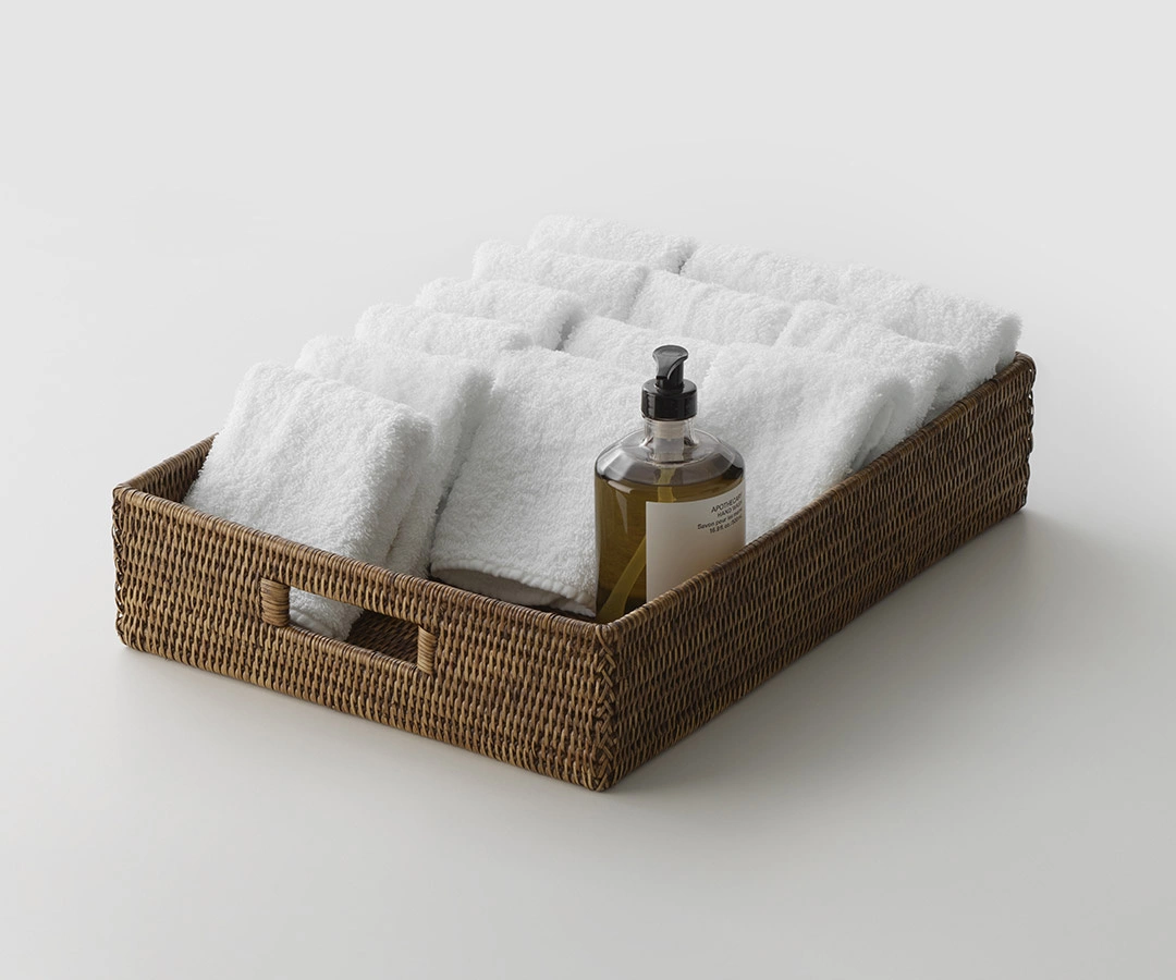 Tacka BASKET TRAY na drobne akcesoria łazienkowe, wykonana z ciemnego rattanu marki Decor Walther. Kolekcja Basket to produkty wykonane z rattanu, materiału pochodzenia naturalnego. Rattan dobrze znosi warunki panujące w łazience takie jak wilgoć.