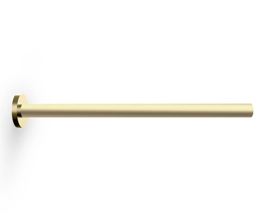 Wieszak na ręcznik kolekcji BAR HTH 1 marki Decor Walther. Prosty kształt relingu osadzonego w okrągłej podstawie. Wykonany z mosiądzu pokryty 24 karatowym matowym złotem.