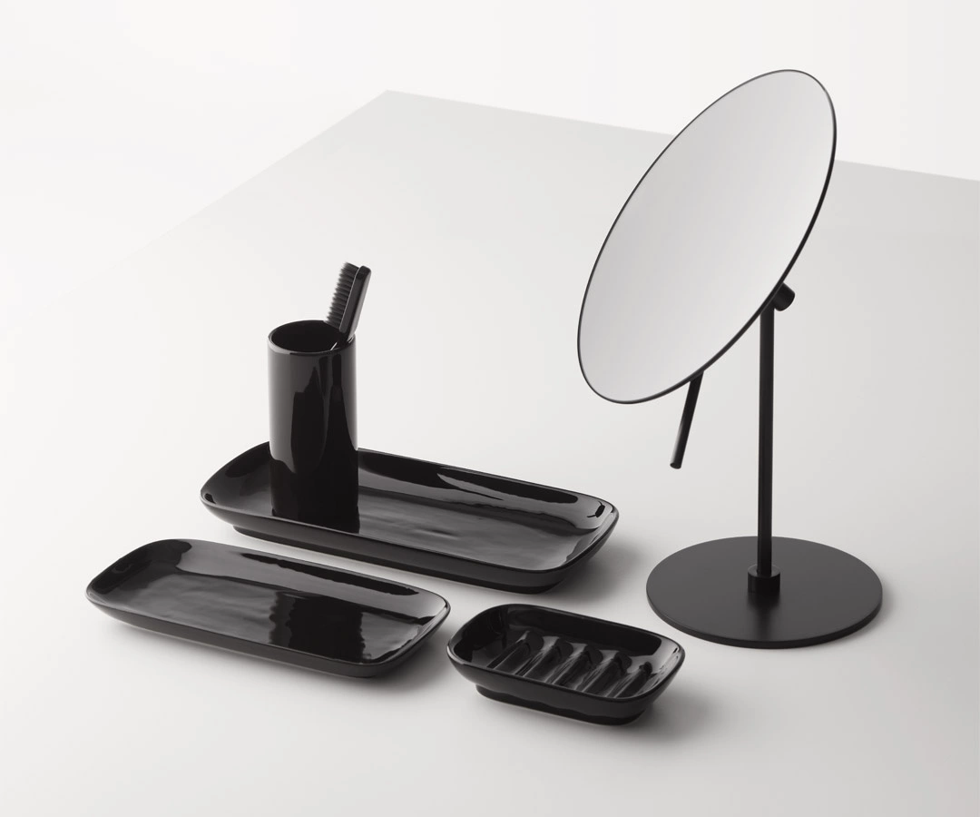 - Podłużna tacka łazienkowa wykonana z porcelany o nieregularnej strukturze. Model DW 541 marki Decor Walther. Świetnie nadaje się na grzebienie lub przybory kosmetyczne. Kolor czarny.