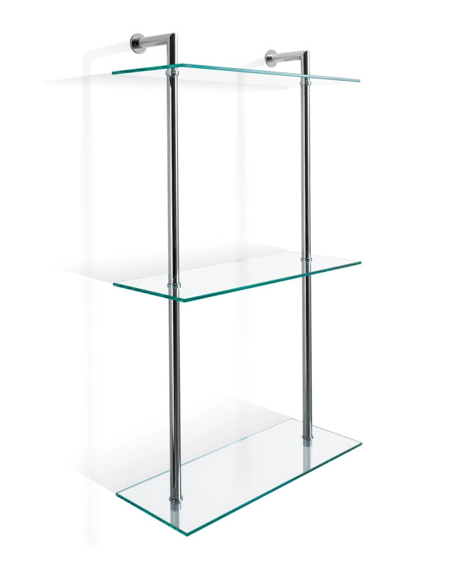 - Półka potrójna szklana DW 016 marki Decor Walther. Trzy prostokątne szklane półki umieszczone w dwóch relingach mocowanych do ściany, wykonanych z mosiądzu pokrytego chromem.