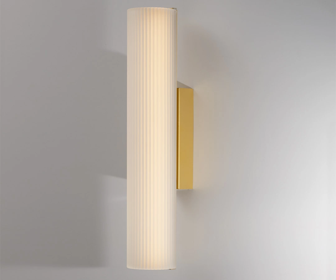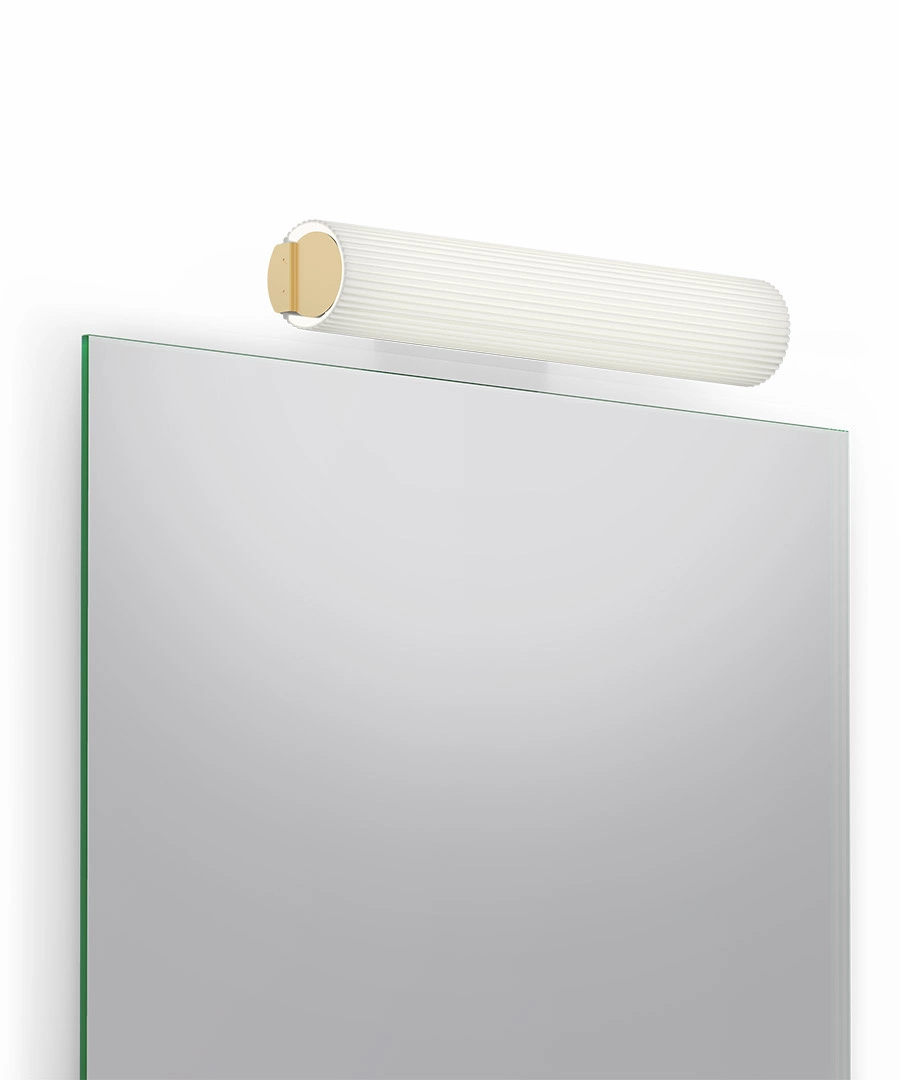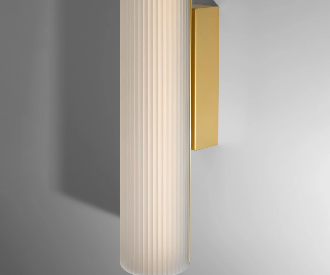 • Kinkiet ścienny Ray marki Decor Walther. Podłużny, prążkowany klosz z białego, satynowego szkła, na mosiężnej podstawie pokrytej 24 karatowym złotem w wykończeniu matowym. Montaż pionowy lub poziomy.