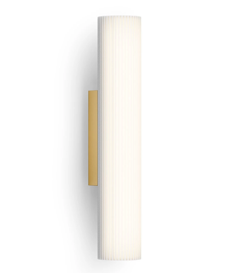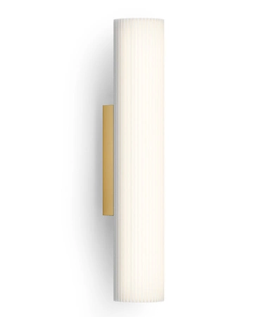 Kinkiet ścienny Ray marki Decor Walther. Podłużny, prążkowany klosz z białego, satynowego szkła, na mosiężnej podstawie pokrytej 24 karatowym złotem w wykończeniu matowym. Montaż pionowy lub poziomy.