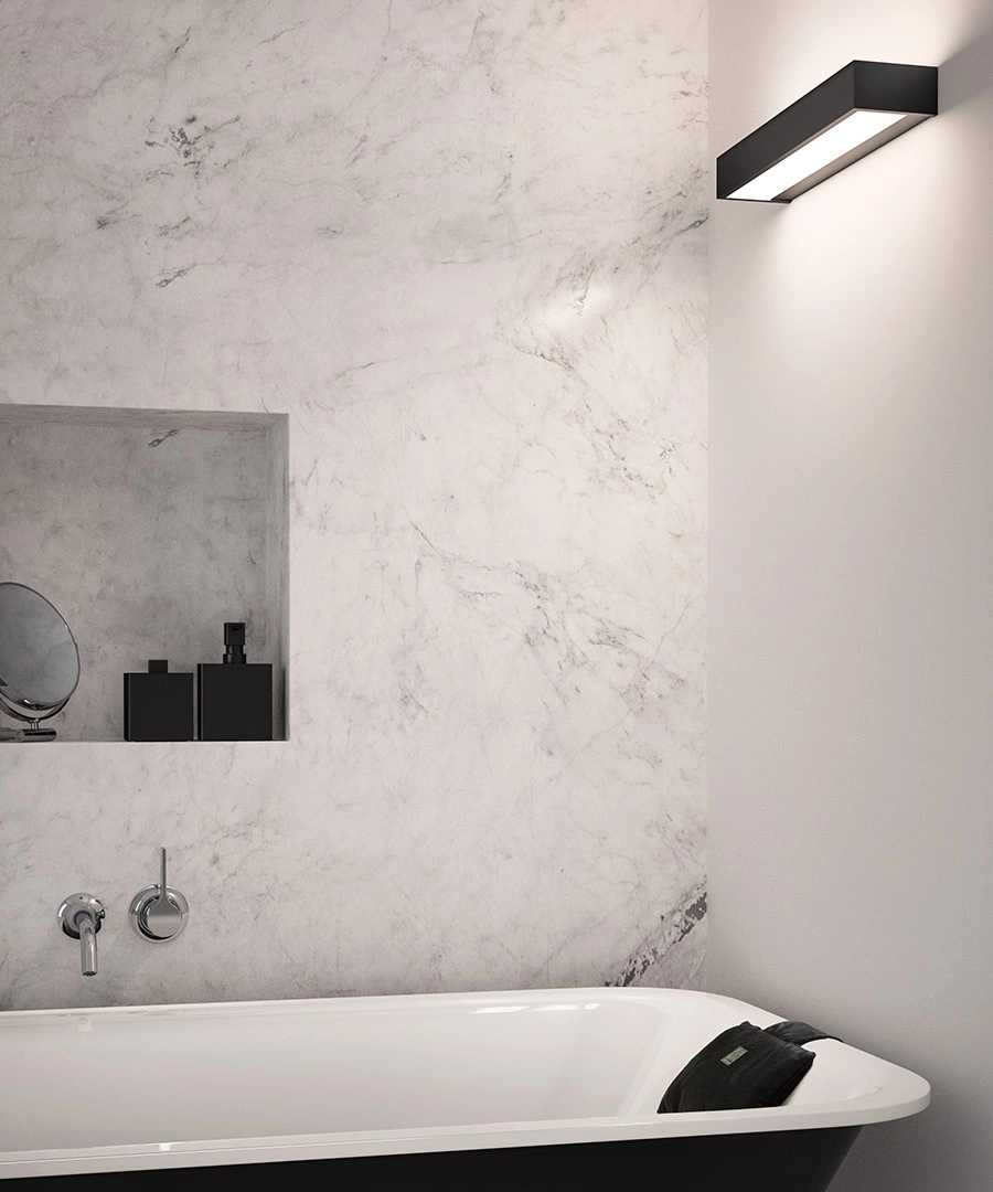 • Lampa ścienna Box LED marki Decor Walther. Podłużny kinkiet z białym, akrylowym, matowym szkłem połączony z mosiądzem lakierowanym na czarny mat. Oświetlenie góra - dół. Występuje w różnych szerokościach. Możliwość przyciemniania światła.
