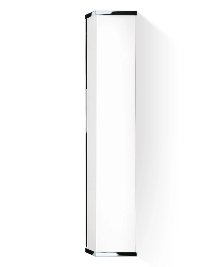 Lampa ścienna o podłużnym kształcie MANHATTAN 60 LED marki Decor Walther. Klosz z białego szkła z połyskiem. Podstawa wykonana z mosiądzu pokrytego chromem. Przyciemnianie oświetlenia za pomocą zewnętrznego ściemniacza z odcięciem fazy. Montaż pionowy lub poziomy.