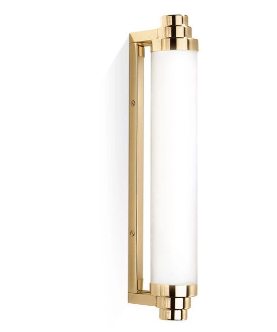 Podłużna lampa ścienna VIENNA 40 LED marki Decor Walther. Klosz z białego, matowego szkła. Podstawa wykonana z mosiądzu pokrytego 24 karatowym złotem. Przyciemnianie oświetlenia za pomocą zewnętrznego ściemniacza z odcięciem fazy. Montaż pionowy lub poziomy.