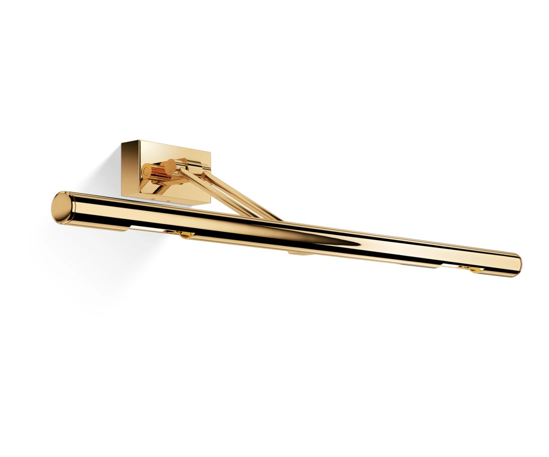- Lampa nad lustro DIM 60 marki Decor Walther. Podłużny kinkiet na obrotowej nóżce wykonany z mosiądzu pokrytego 24 karatowym złotem. Na podstawie mocowanej do ściany znajduje się włącznik do regulacji oświetlenia. Żarówki nie są w komplecie z lampą.