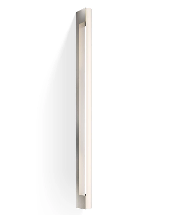 Lampa ścienna, podłużny kinkiet OMEGA 200 LED marki Decor Walther. Dwie podstawy wykonane z niklowanego mosiądzu w wykończeniu satynowym. Żarówka rurowa LED nie jest dołączona do zestawu. Montaż pionowy lub poziomy.
