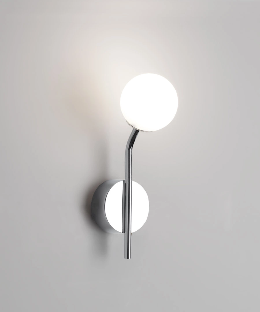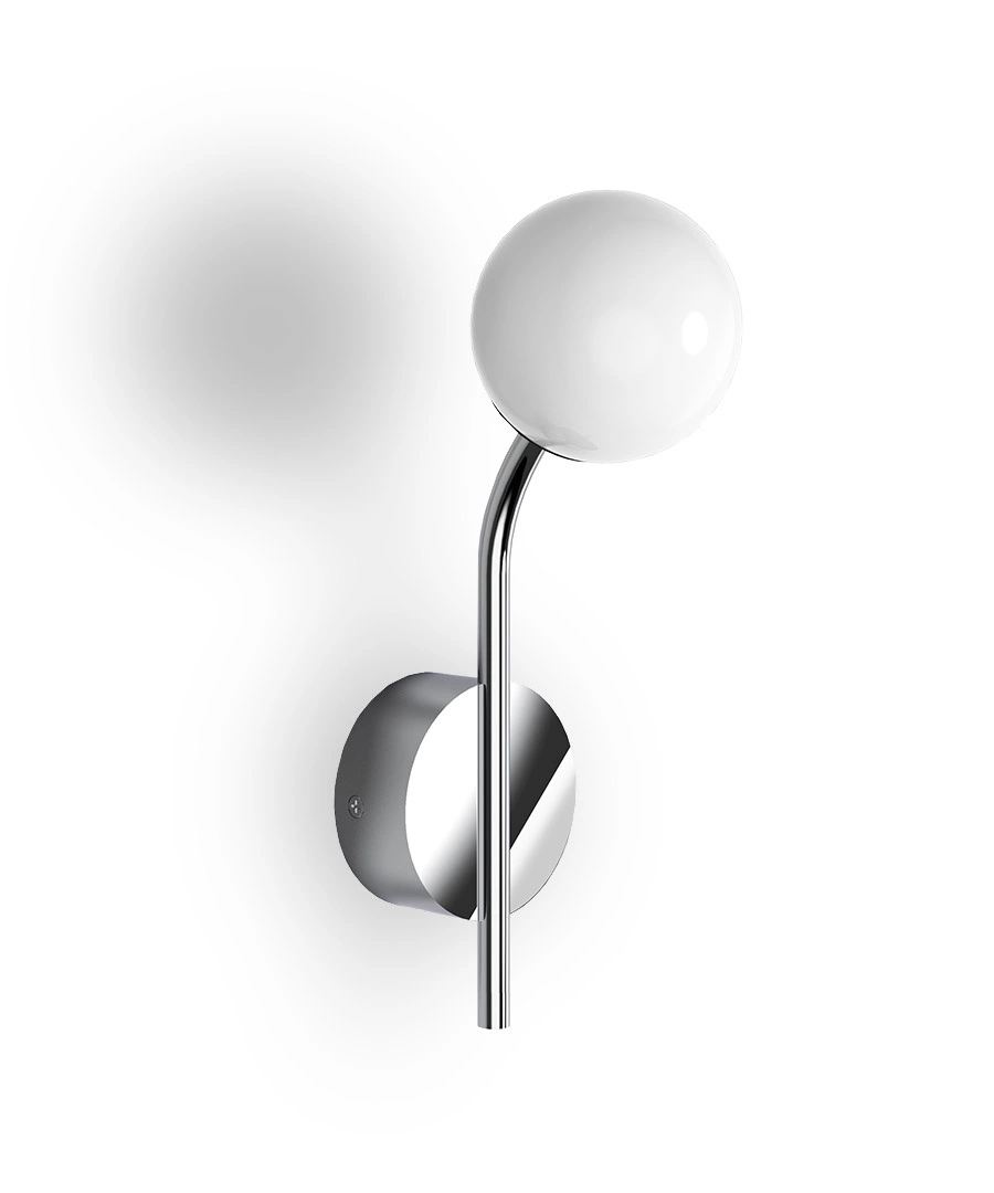 Lampa ścienna PEP ONE marki Decor Walther. Kula z matowego, białego szkła osadzona na ramieniu przymocowanym do okrągłej, stalowej, chromowanej podstawy. Żarówka nie jest dołączona do kompletu. Pasuje również do kolekcji MIKADO.