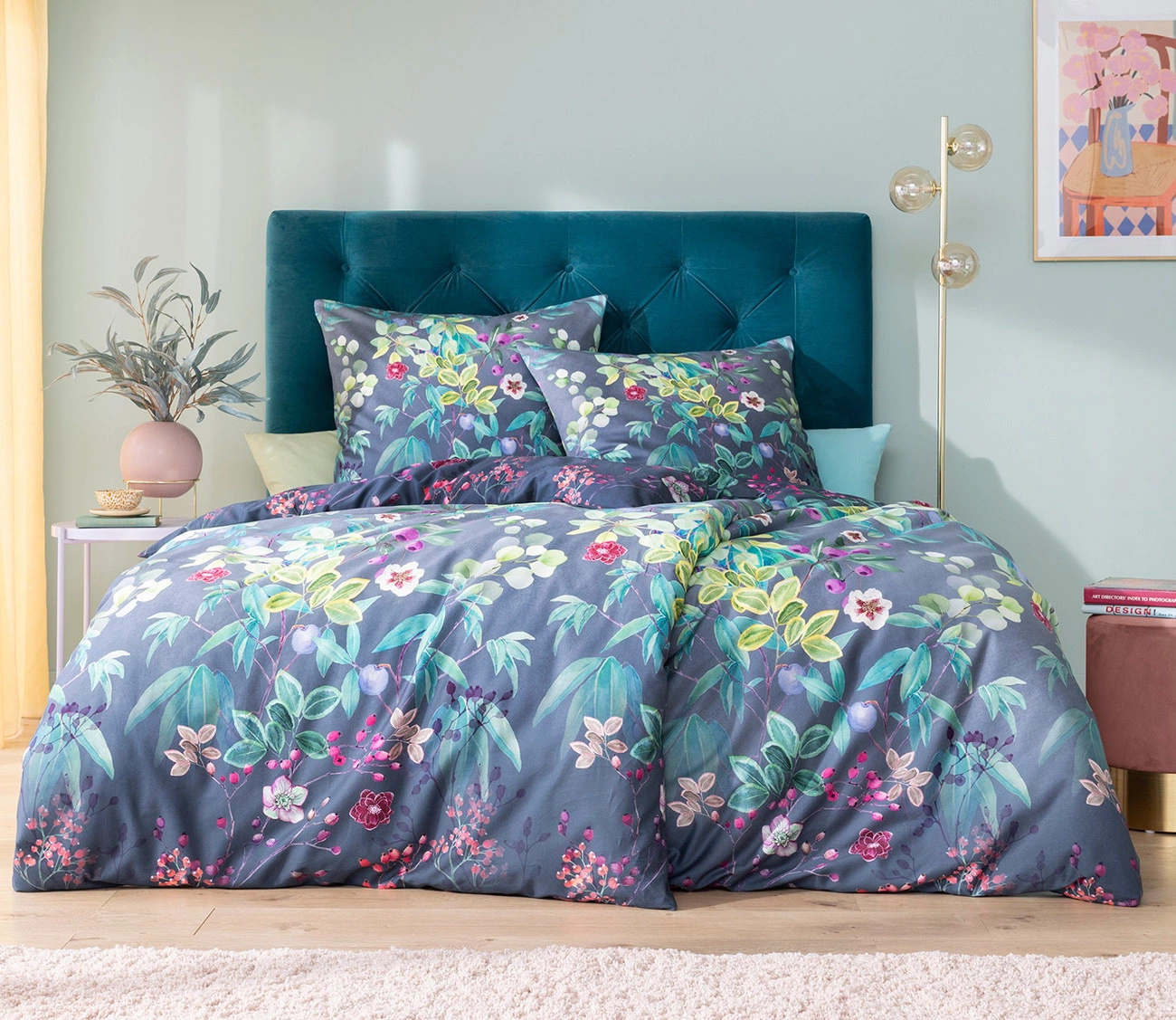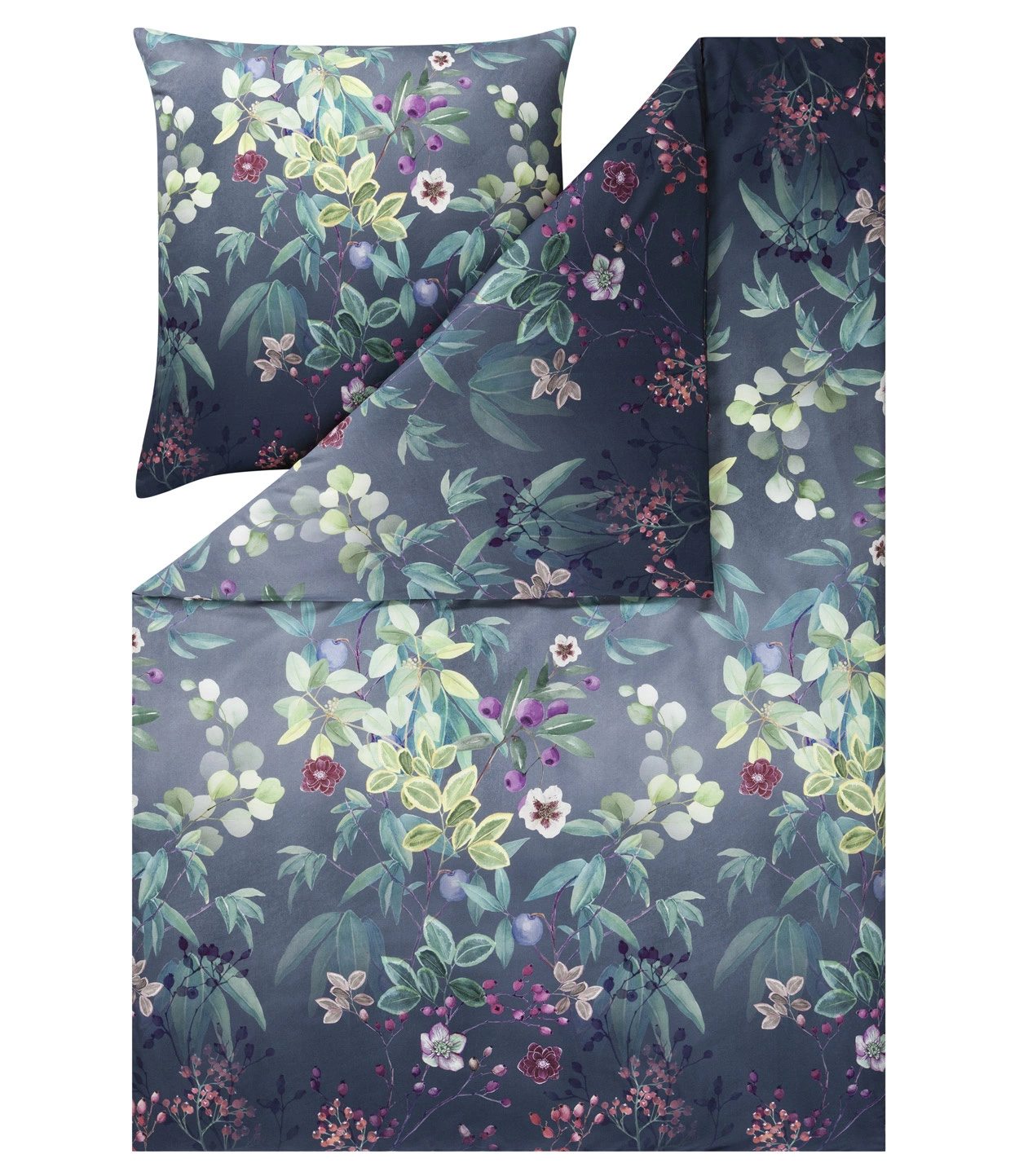 Pościel z satyny bawełnianej Bonny 4817-920 marki Estella. Motyw roślinny na niebiesko-szarym tle. Wyprodukowana jest w 100% z czystej, czesanej mako-bawełny. Satyna z firmy Estella jest niezwykle przyjemna i przyjazna dla skóry.
