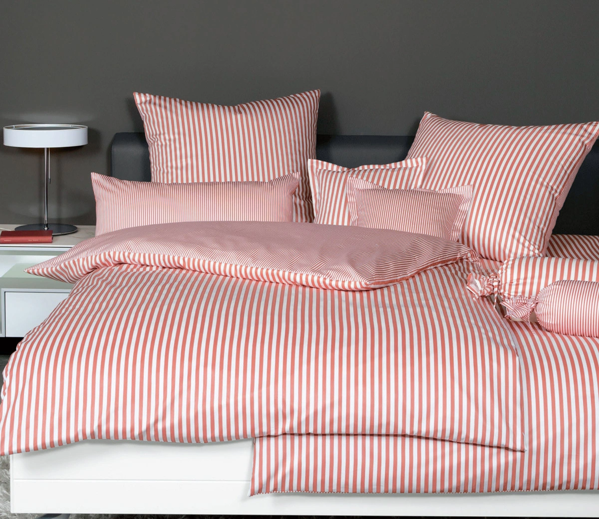 - Dwustronna pościel w pasy Modern Classic 3912-44 w kolorze koralowym. Przód z cienkimi, a tył z jeszcze cieńszymi paseczkami w kolorze bieli. Wykonana z satyny bawełnianej ze 100% bawełny mako. Dzięki procesowi merceryzacji pościel zachwyca połyskiem.