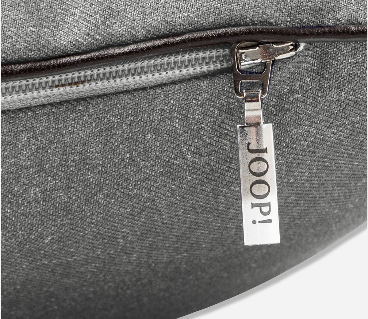 • Dekoracyjna poszewka Essential Anthrazit marki JOOP!. Minimalistyczna, kolor antracytowy, z lamówką z ekoskóry i eleganckim emblematem w rogu ze skóry naturalnej. Zapinana na zamek błyskawiczny z grawerowanym logo.