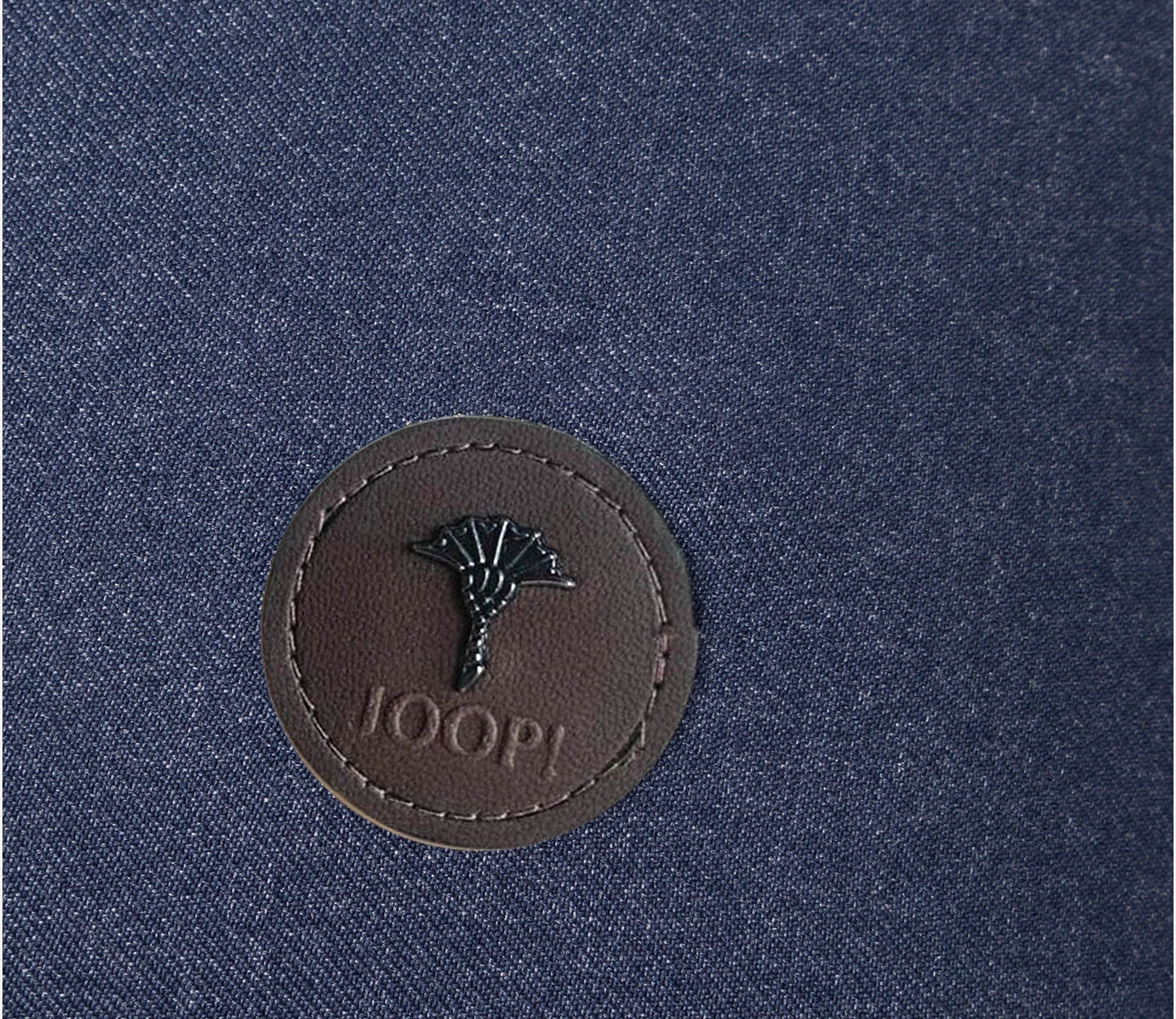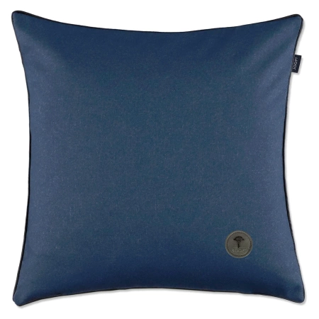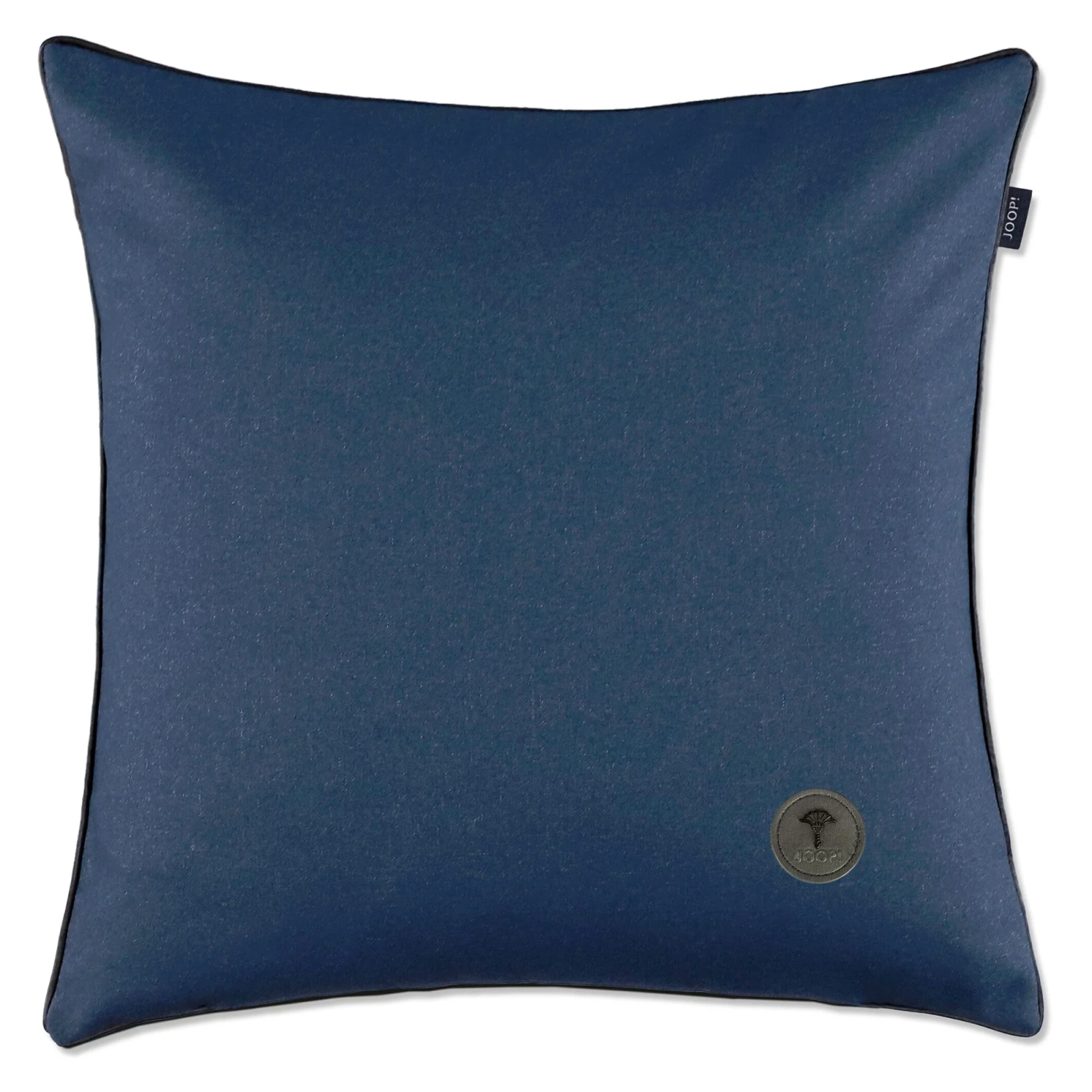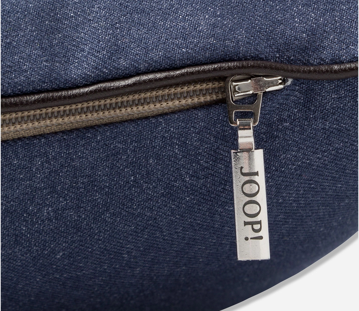 • Dekoracyjna poszewka Essential Marine marki JOOP!. Minimalistyczna, kolor granatowy, z lamówką z ekoskóry i eleganckim emblematem w rogu ze skóry naturalnej. Zapinana na zamek błyskawiczny z grawerowanym logo.