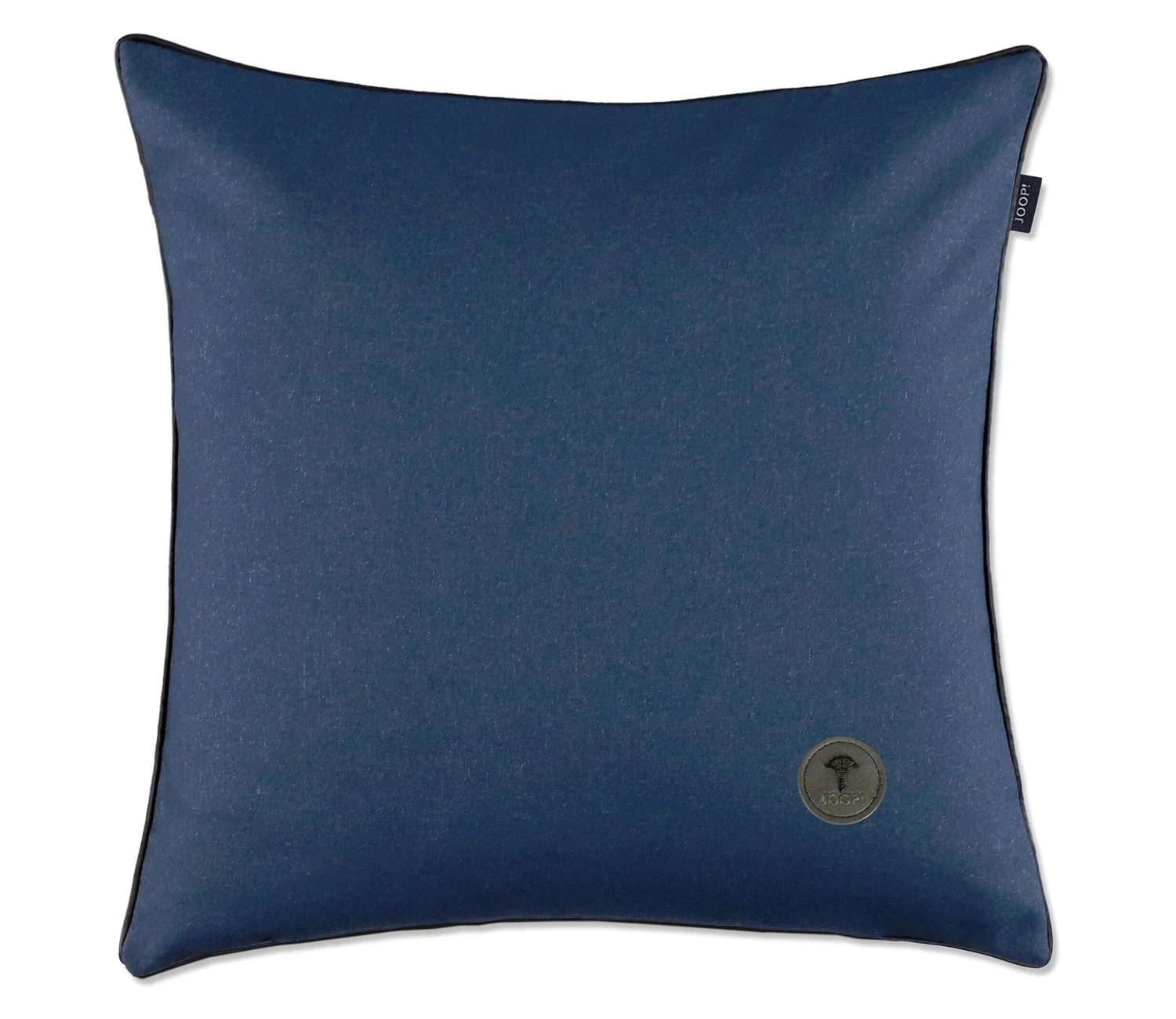 Dekoracyjna poszewka Essential Marine marki JOOP!. Minimalistyczna, kolor granatowy, z lamówką z ekoskóry i eleganckim emblematem w rogu ze skóry naturalnej. Zapinana na zamek błyskawiczny z grawerowanym logo.