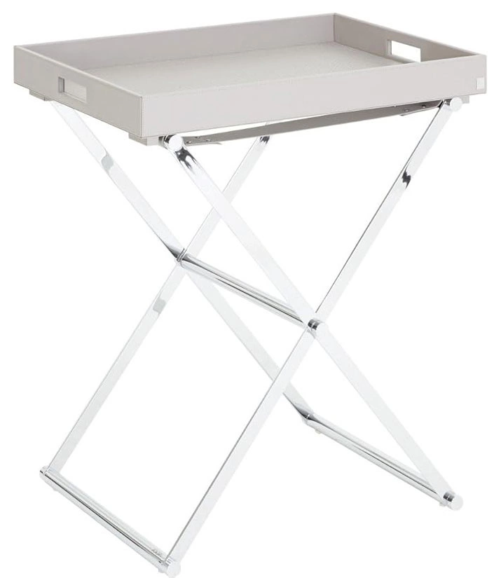 Pomocniczy stolik JOOP! Homeline XL. Składa się z dużej, tacy, którą można zdjąć. Taca pokryta białą ekoskórą, dół z efektownej plecionki. Podstawa chromowana, możliwość złożenia na płasko i schowania.