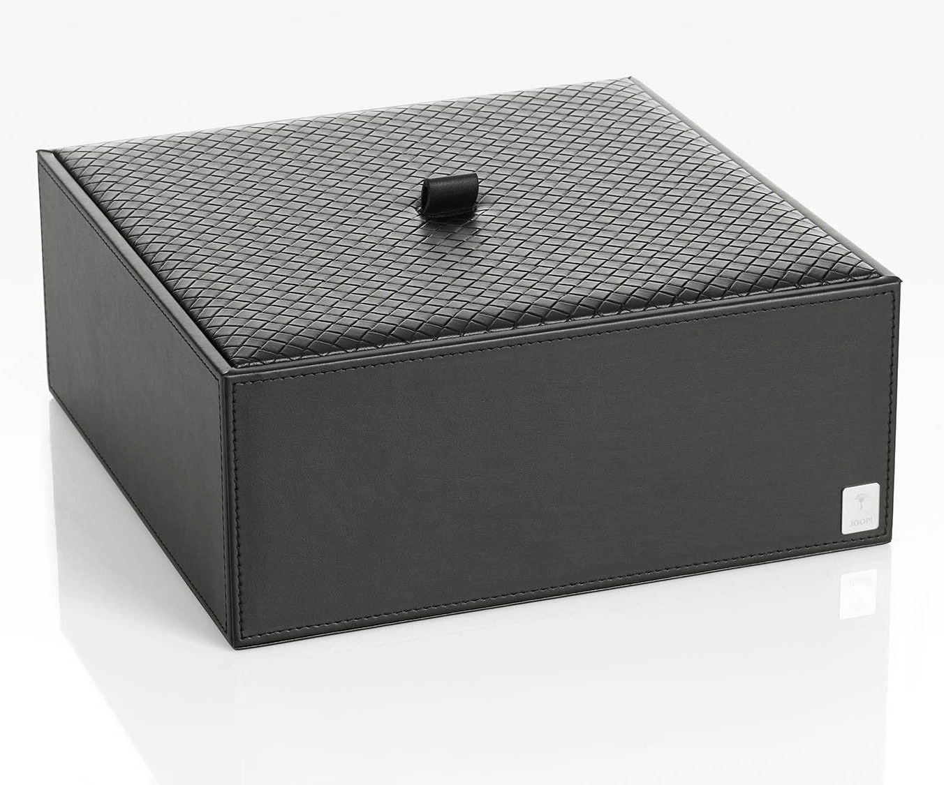 - Pudełko z przykrywką Homeline Black XL marki JOOP!. Idealny dodatek do salonu lub łazienki, pomocny przy przechowywaniu i organizacji przestrzeni. Wykonany z czarnej ekoskóry z biała efektowną plecionką na pokrywce.