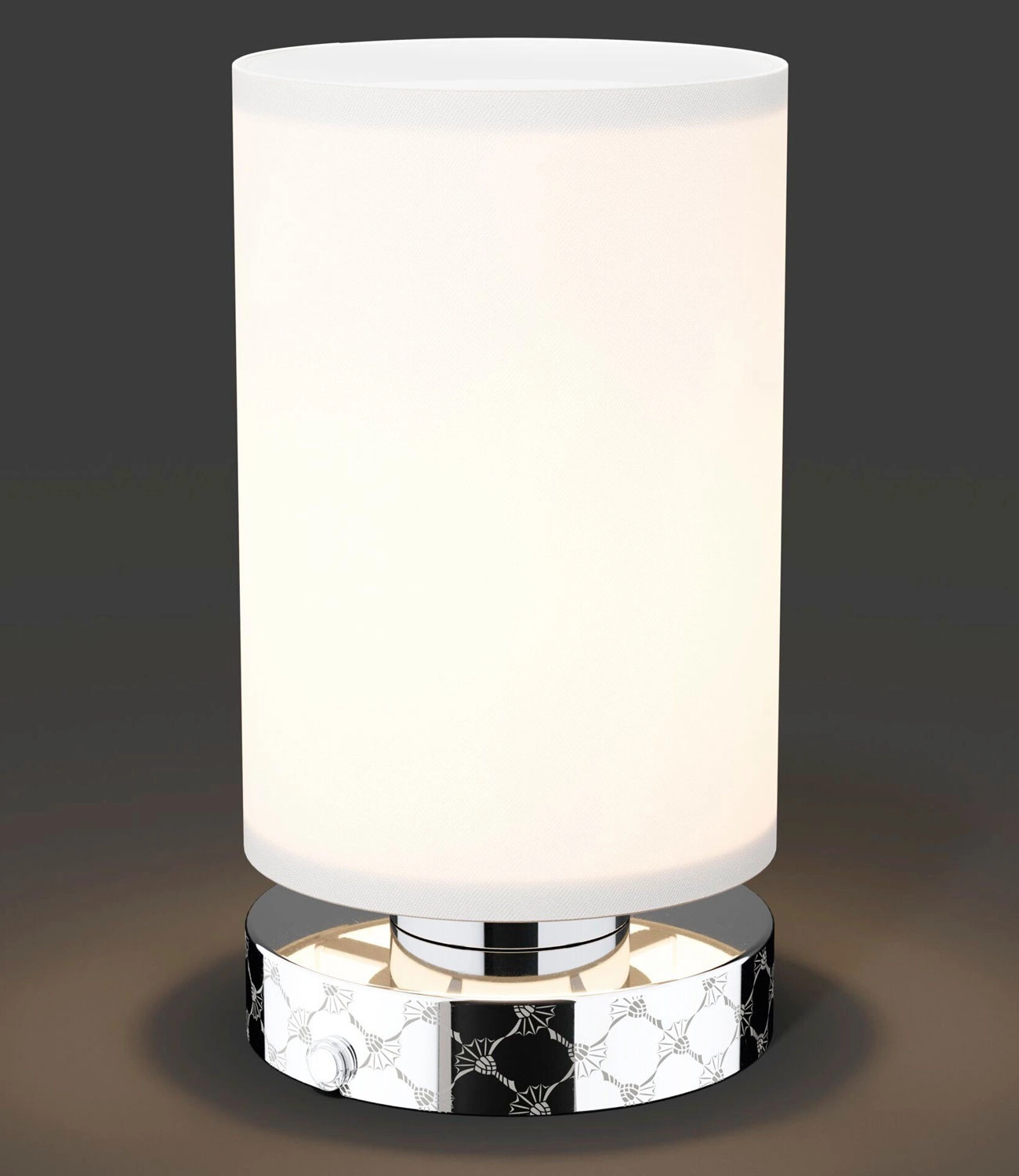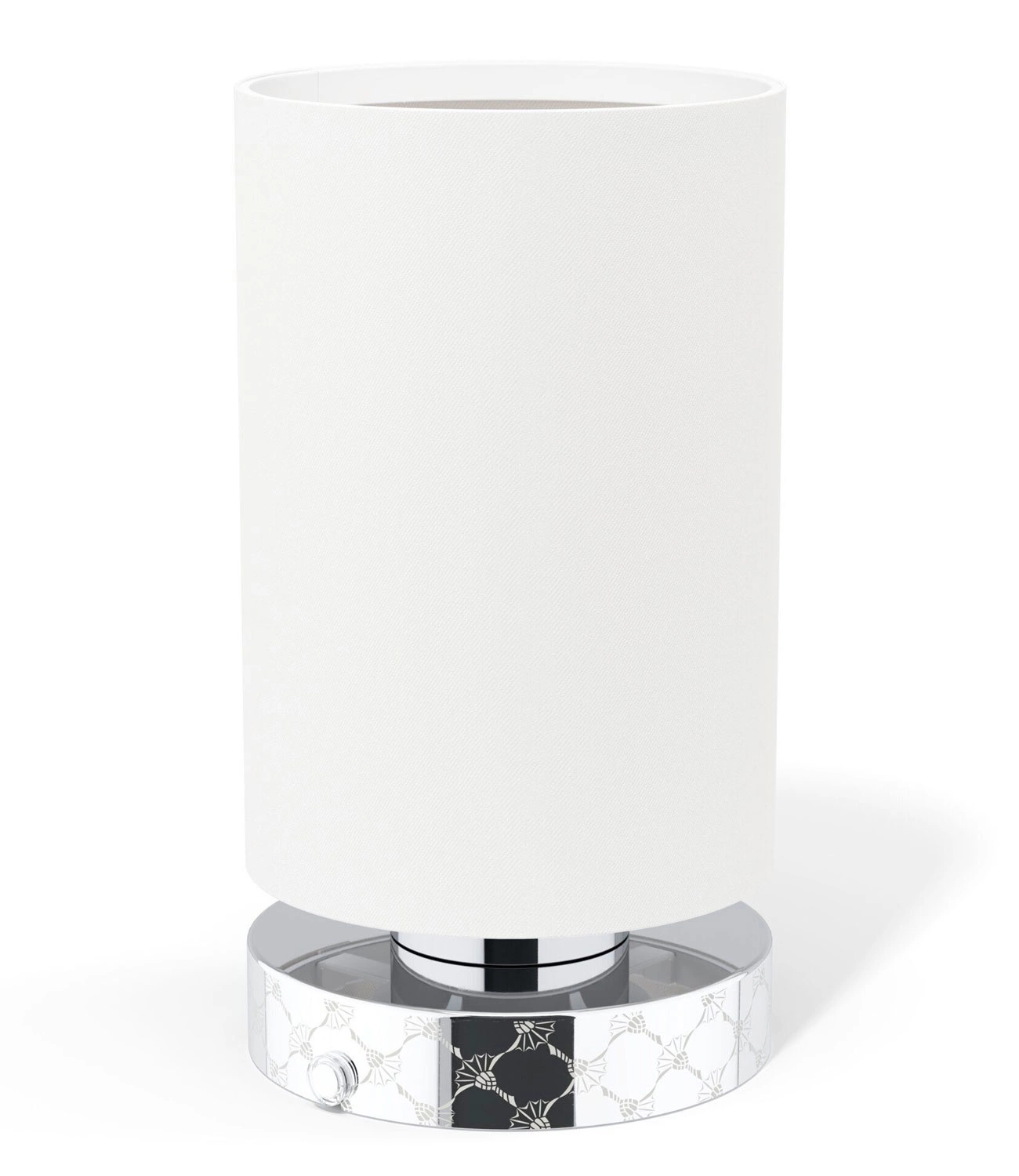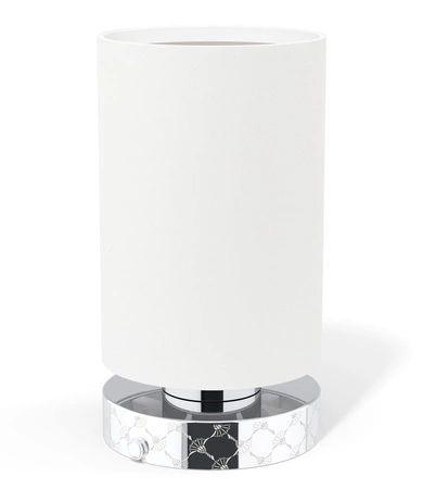- Przenośna, designerska lapa MOVE LIGHTS 34233 zasilana na baterie. Światło LED. Okrągła, chromowana podstawa z wytłaczanym wzorem cornflower, biały, tekstylny klosz. Idealna do domu lub na taras. Ładowana za pomocą dołączonego kabla.