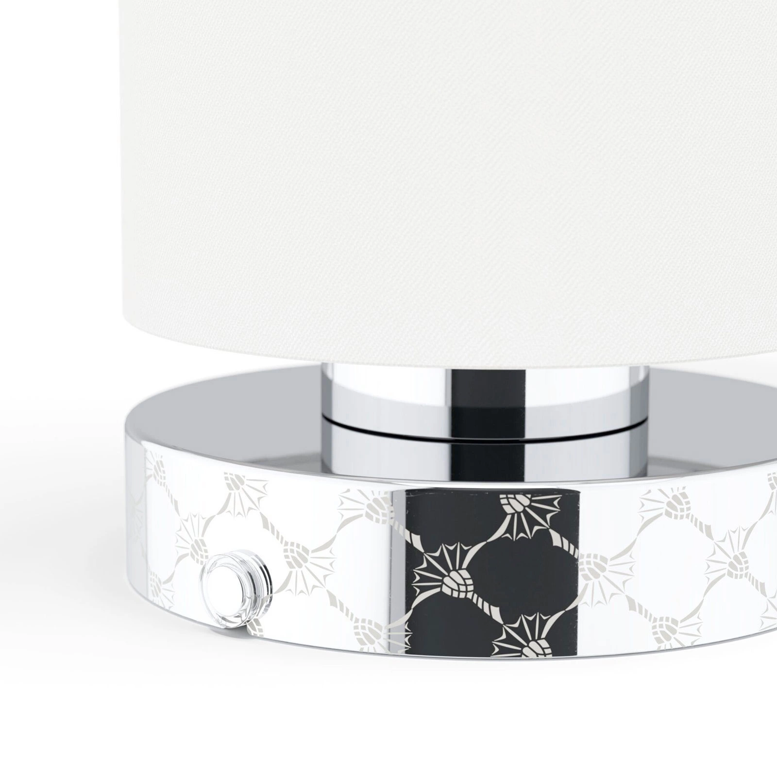 Przenośna, designerska lapa MOVE LIGHTS 34233 zasilana na baterie. Światło LED. Okrągła, chromowana podstawa z wytłaczanym wzorem cornflower, biały, tekstylny klosz. Idealna do domu lub na taras.