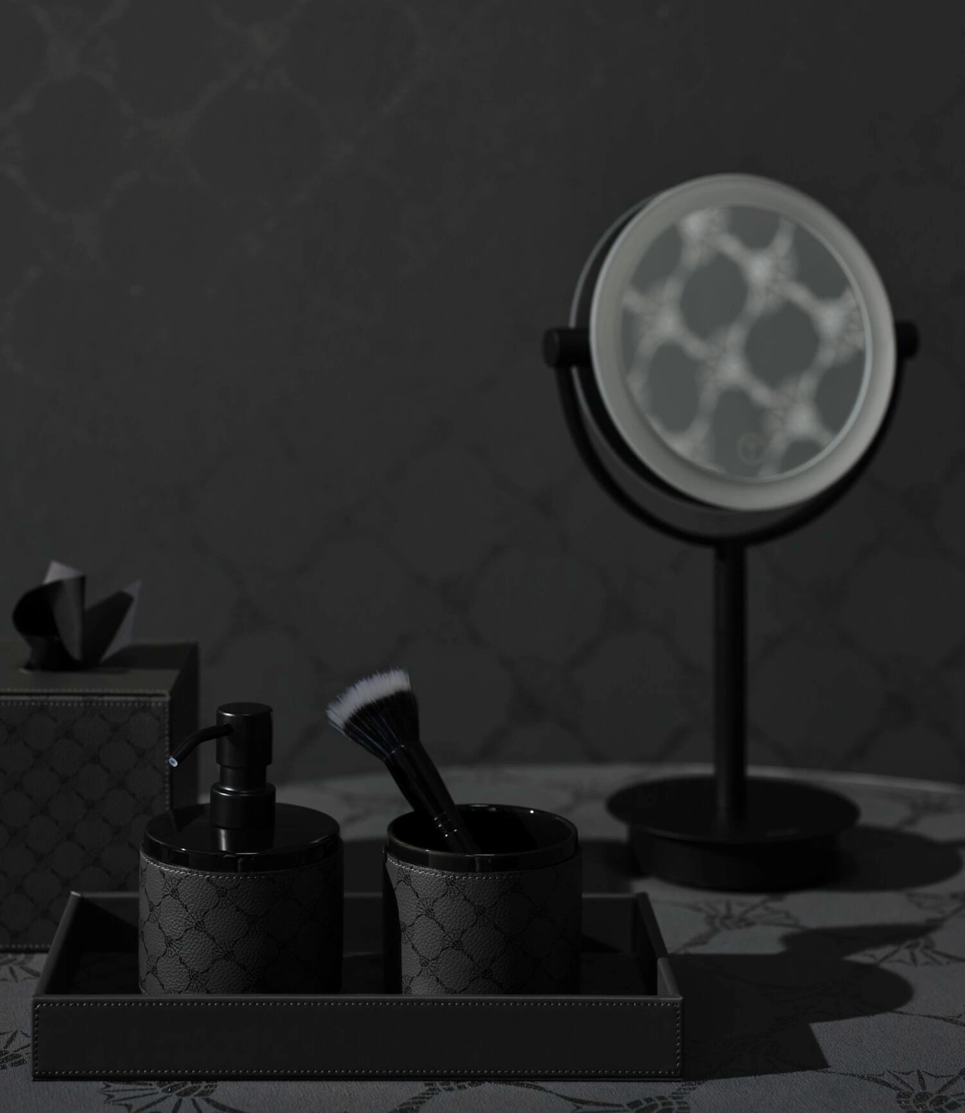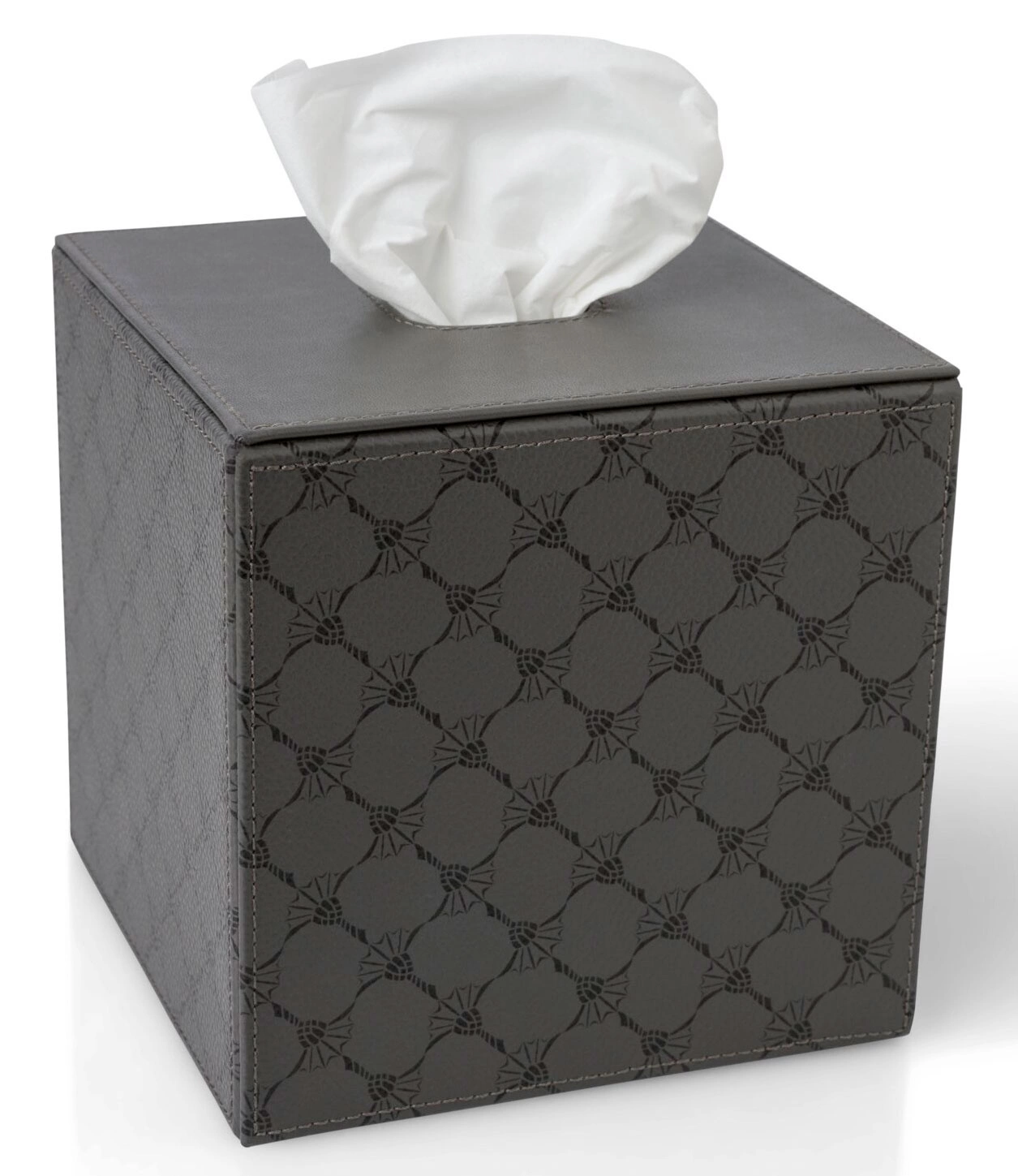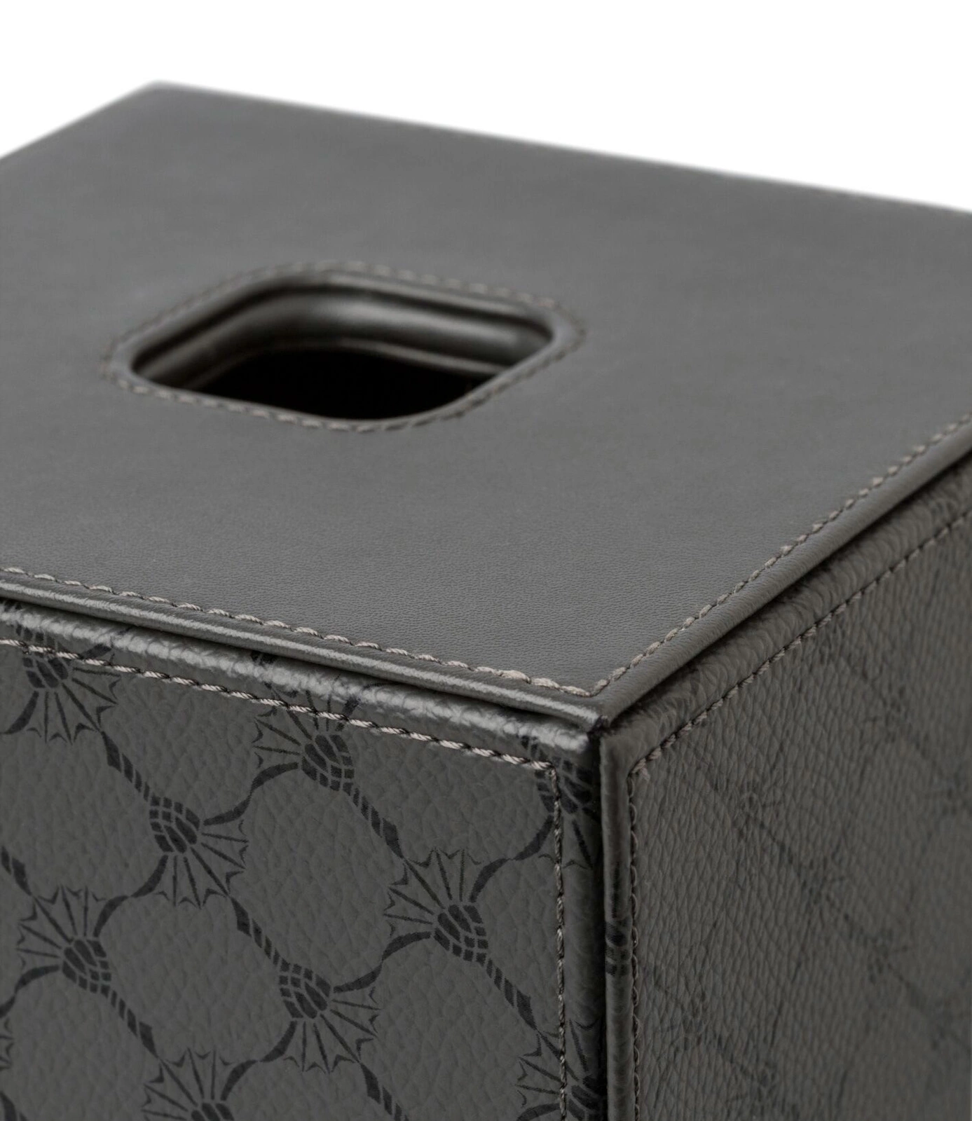Pudełko na chusteczki w formie nakładki. Model Cornflower marki JOOP!. Wykonane ze skóry ekologicznej. Kolor antracytowy z czarnym motywem cornflower.
