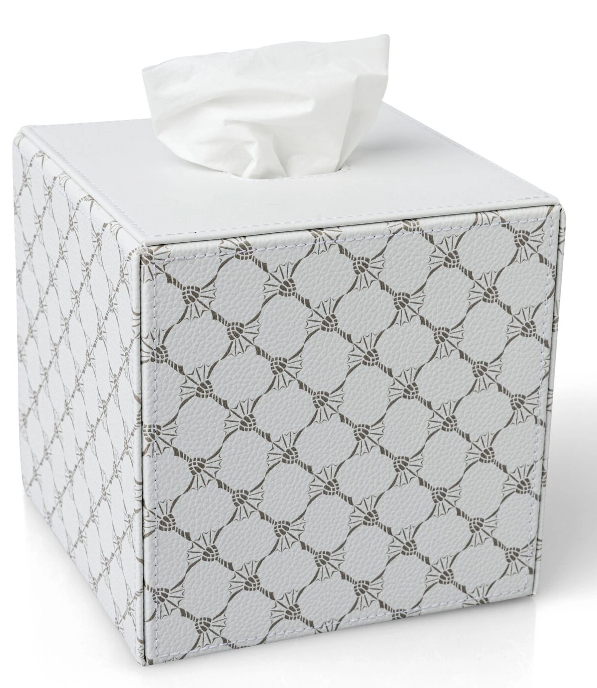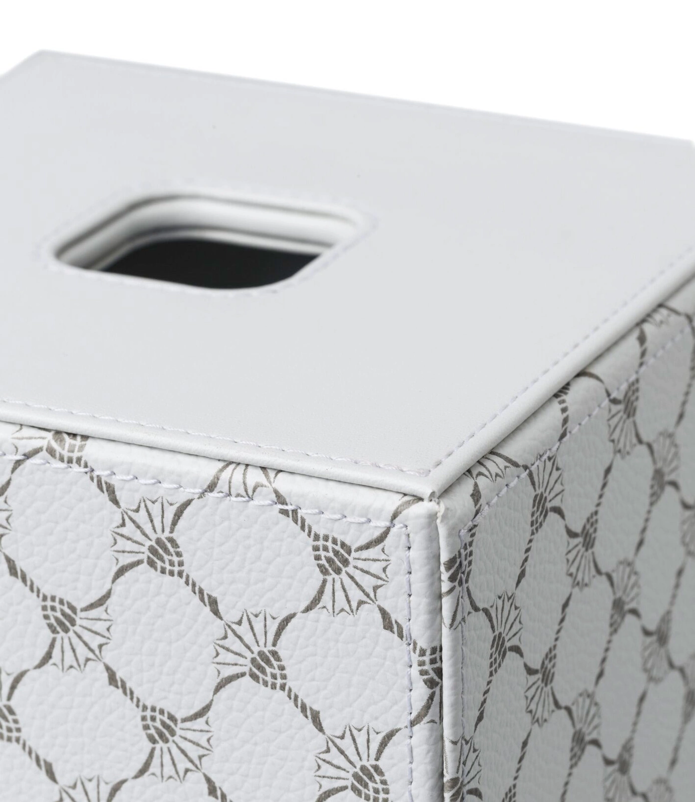 Pudełko na chusteczki w formie nakładki. Model Cornflower marki JOOP!. Wykonane ze skóry ekologicznej. Kolor biały z beżowym motywem cornflower.