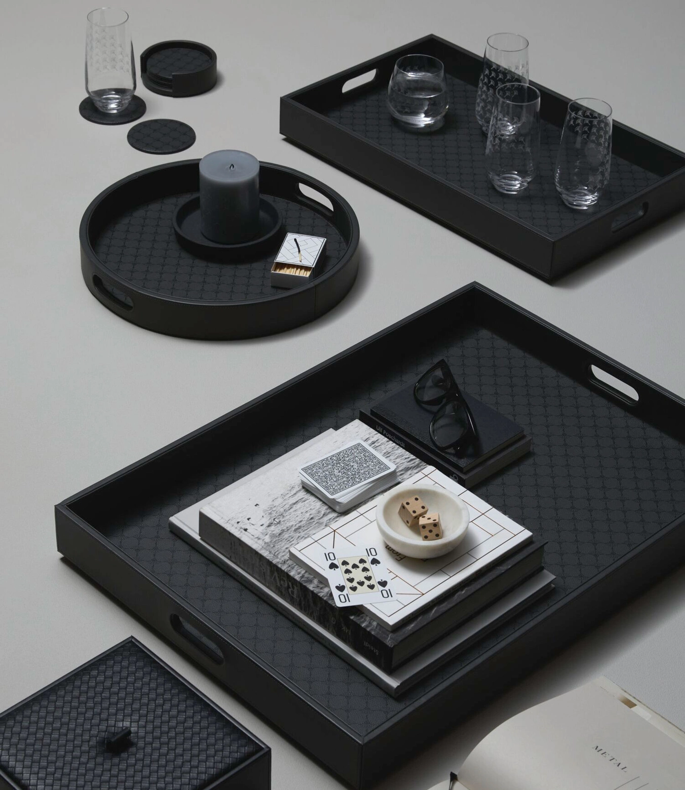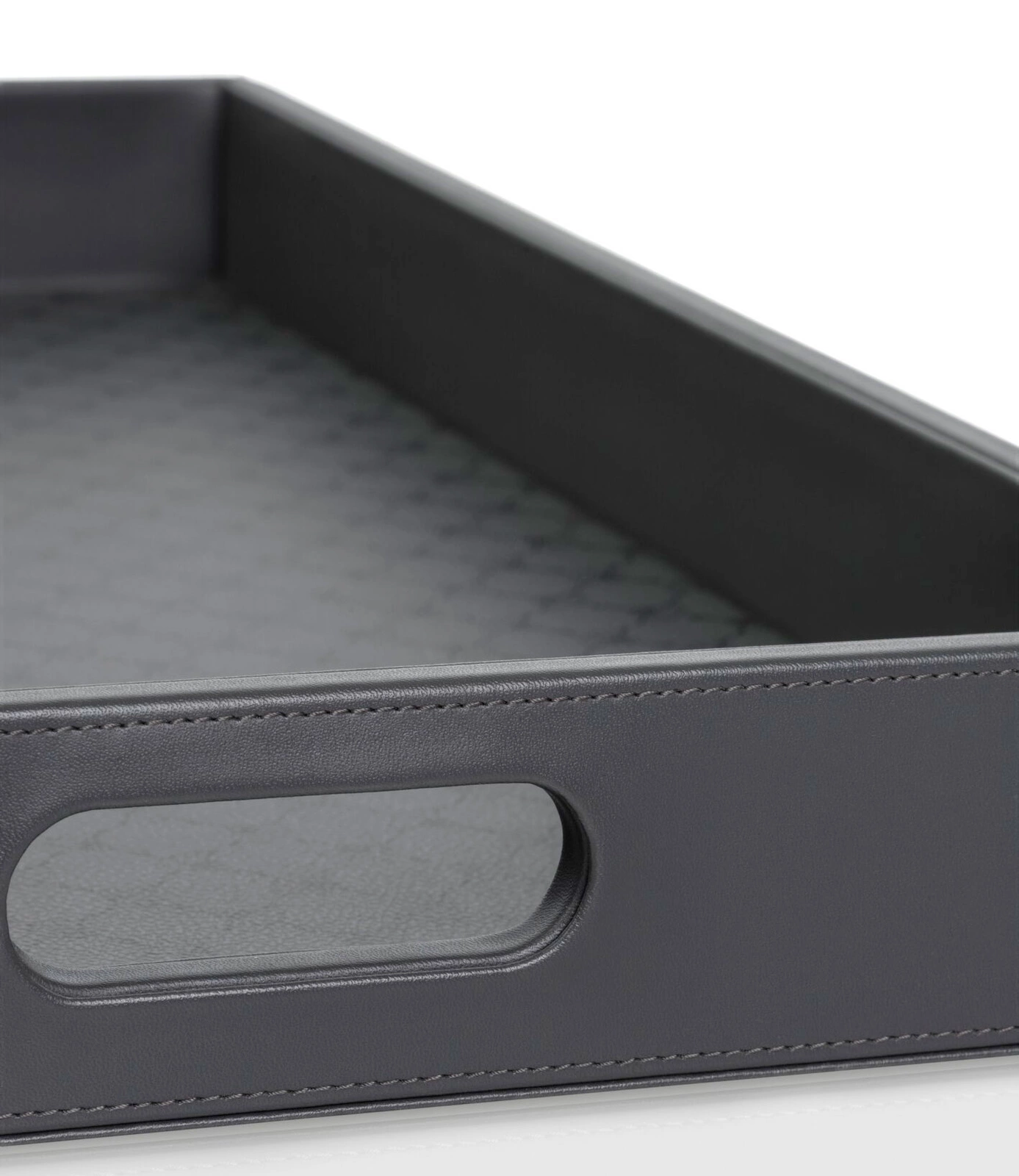Prostokątna taca do serwowania Cornflower marki JOOP. Wykonana ze skóry ekologicznej, kolor antracytowy, dno z motywem cornflower w kolorze czarnym.