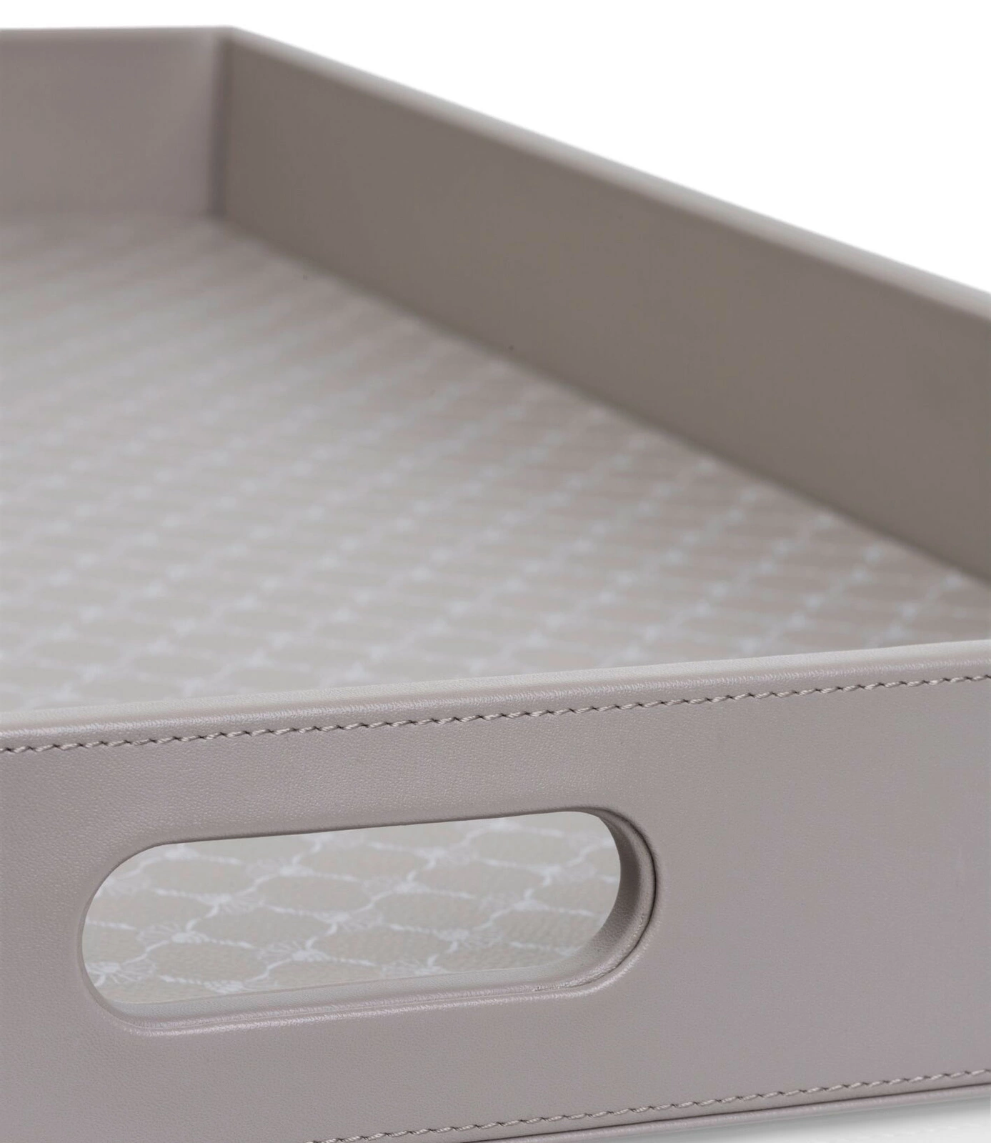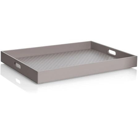 Duża, prostokątna taca do serwowania Cornflower marki JOOP. Wykonana ze skóry ekologicznej, kolor beżowo-szary (taupe), dno z motywem cornflower w kolorze białym.