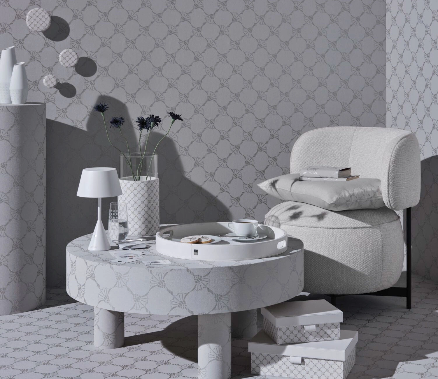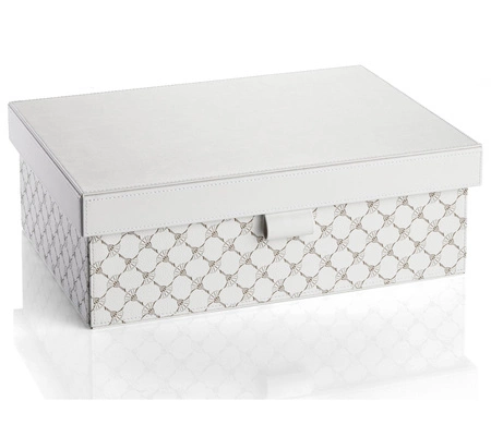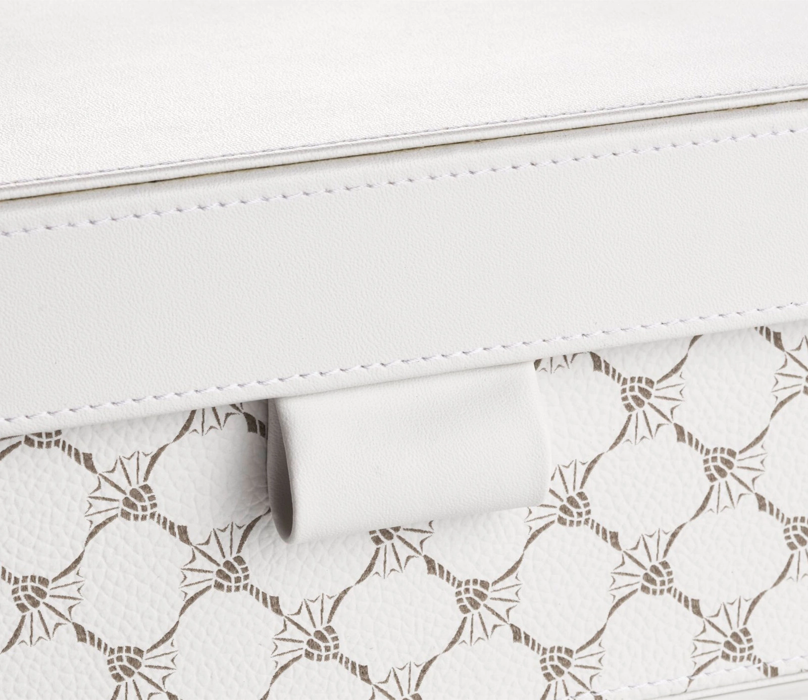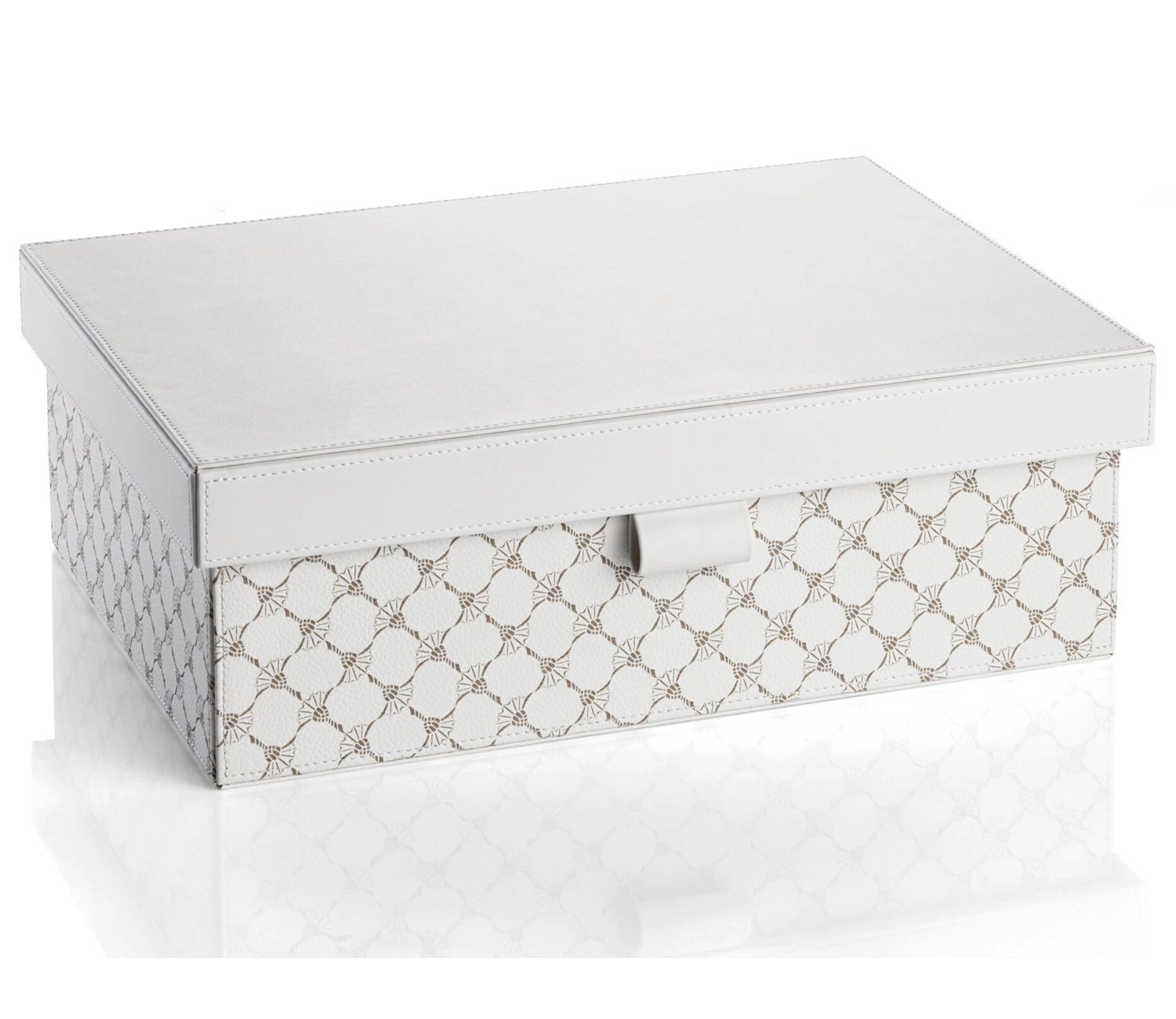 Pudełko z przykrywką Cornflower L White marki JOOP!. Idealny dodatek do salonu lub łazienki, pomocny przy przechowywaniu i organizacji przestrzeni. Wykonany z białej ekoskóry z szarym motywem cornflower.