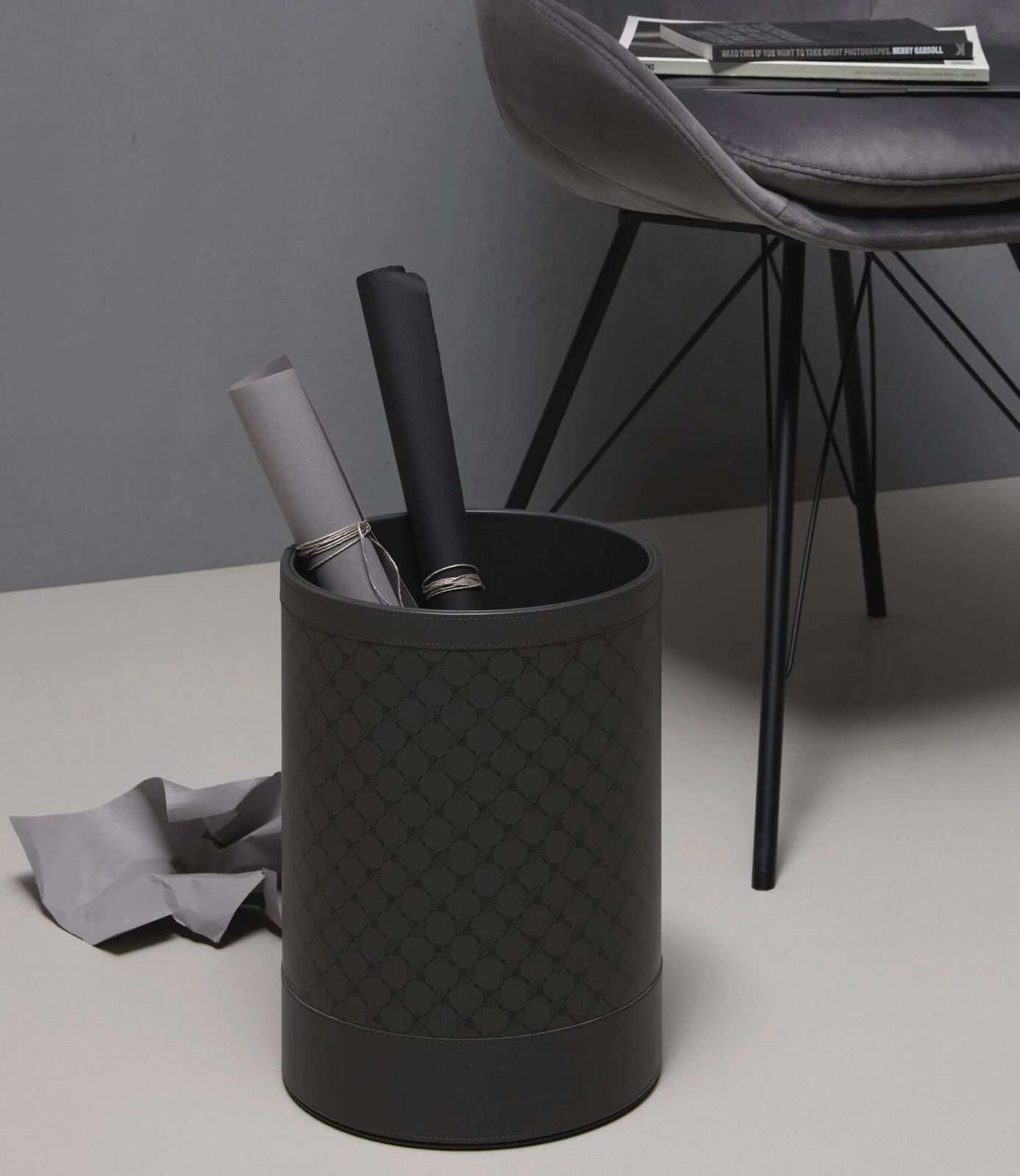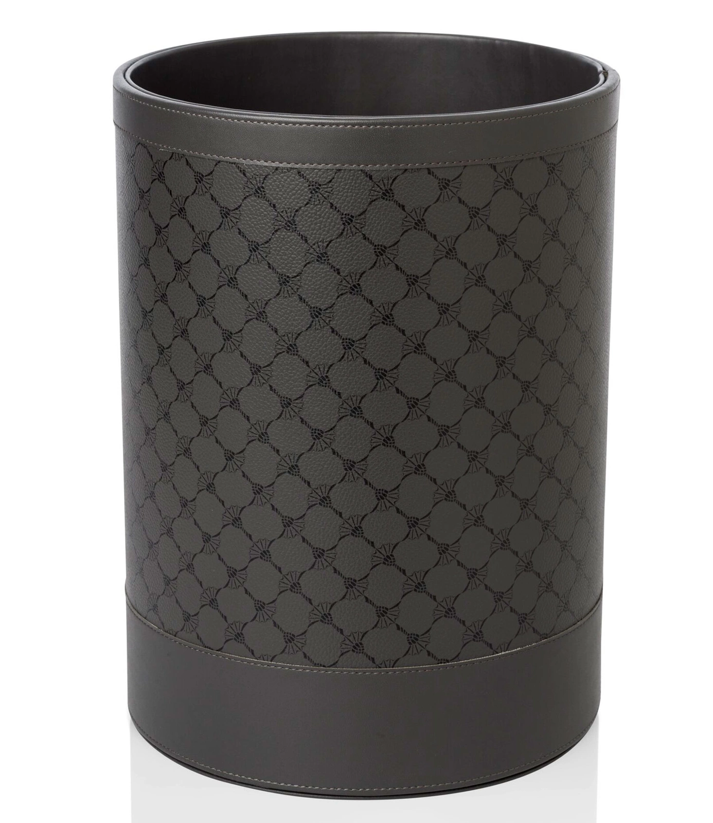 Kosz na papier lub suche śmieci Cornflower marki JOOP!. Okrągły kształt, wykonany z antracytowej ekoskóry ozdobionej czarnym motywem cornflower.