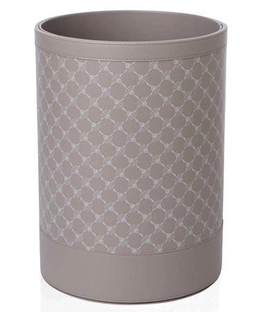 - Kosz na papier lub suche śmieci Cornflower marki JOOP!. Okrągły kształt, wykonany z szaro-beżowej ekoskóry ozdobionej białym motywem cornflower.