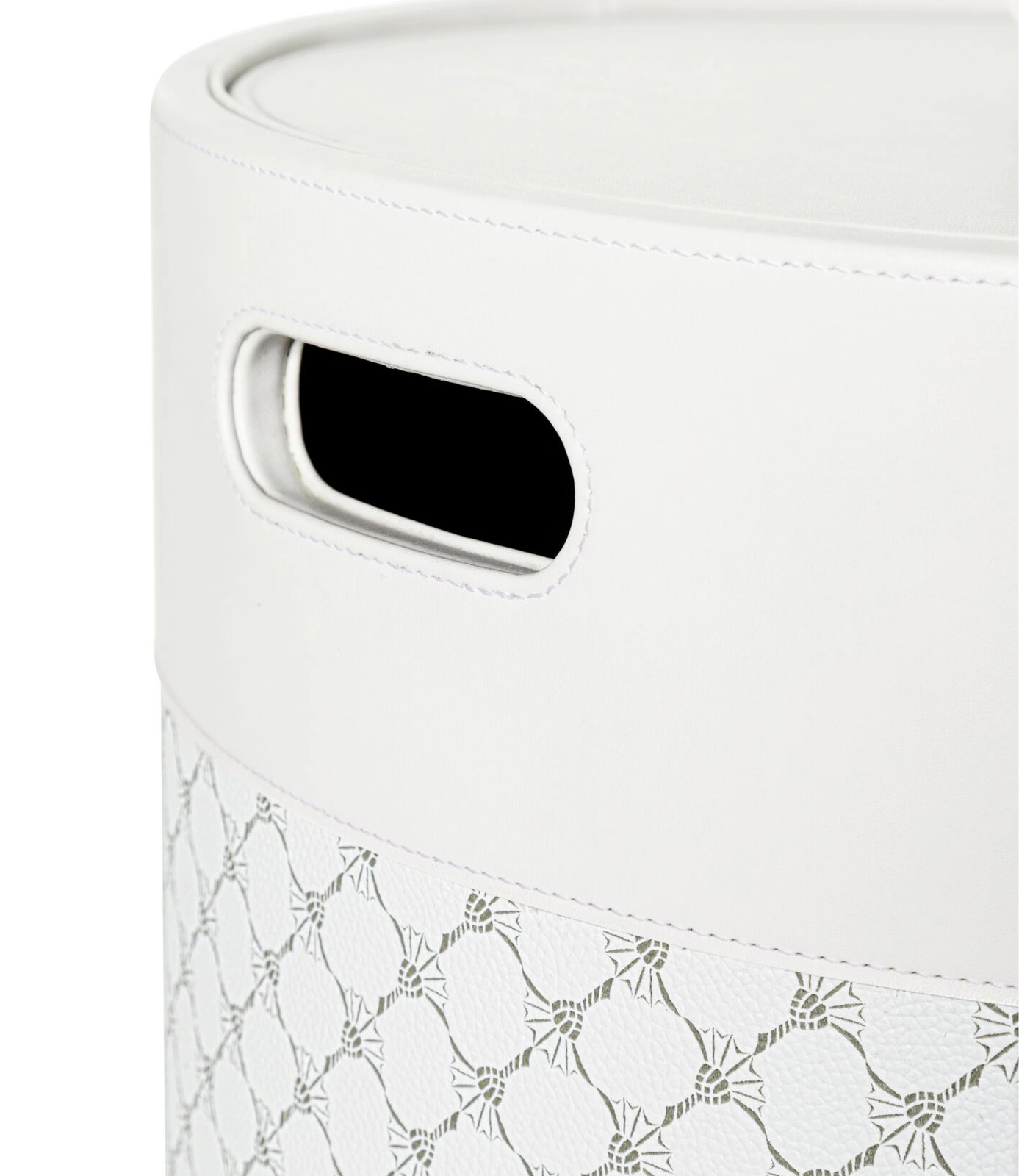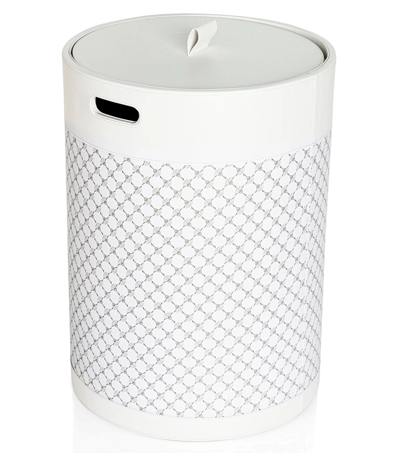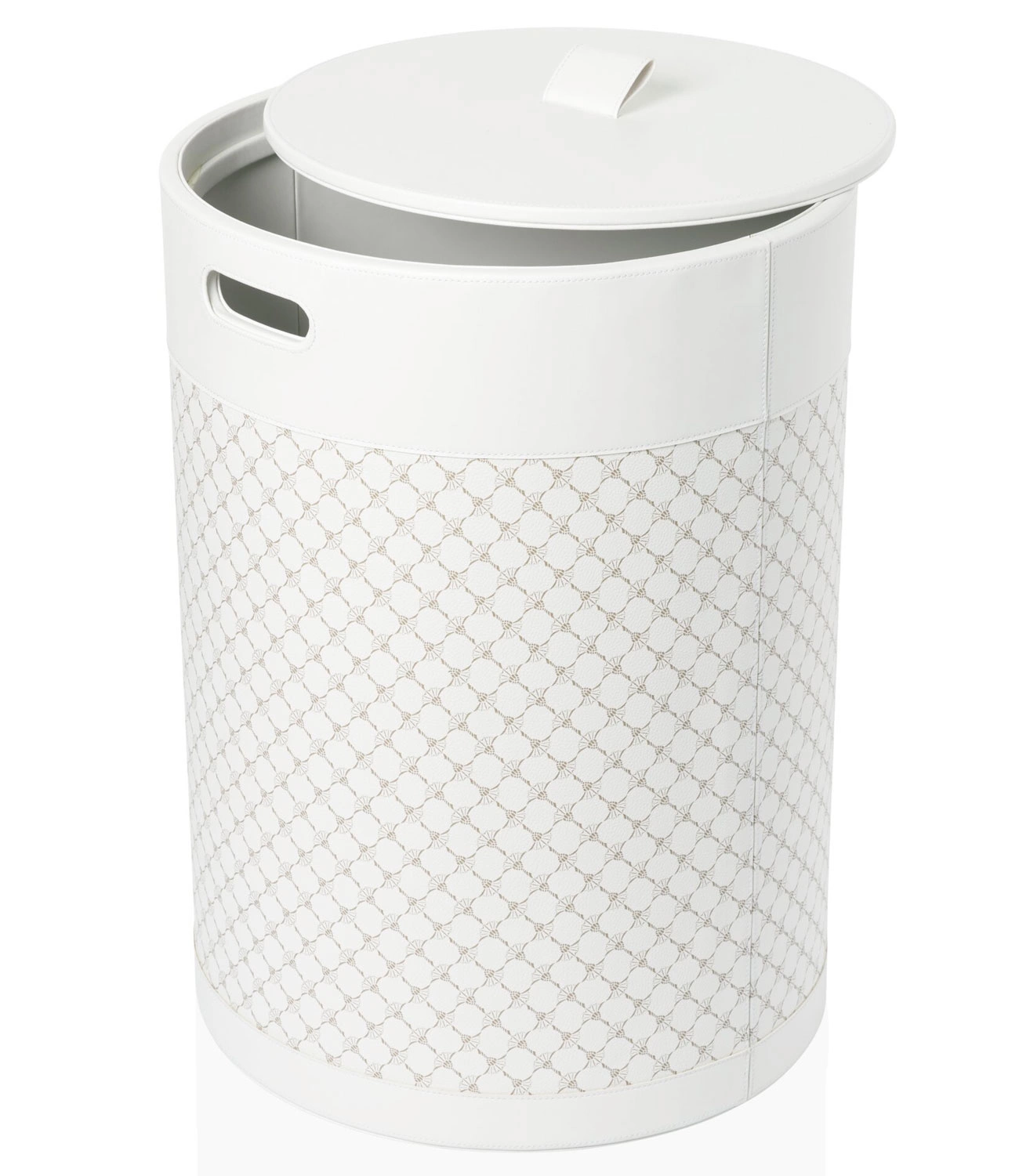 - Okrągły kosz na pranie Cornflower Grey marki JOOP!. Wyposażony w pokrywę z poręcznym uszkiem, oraz dwa uchwyty. Wykonany z ekoskóry w kolorze białym z szarym motywem cornflower.